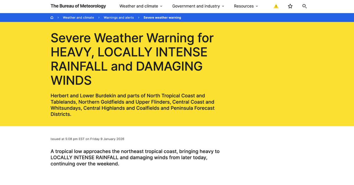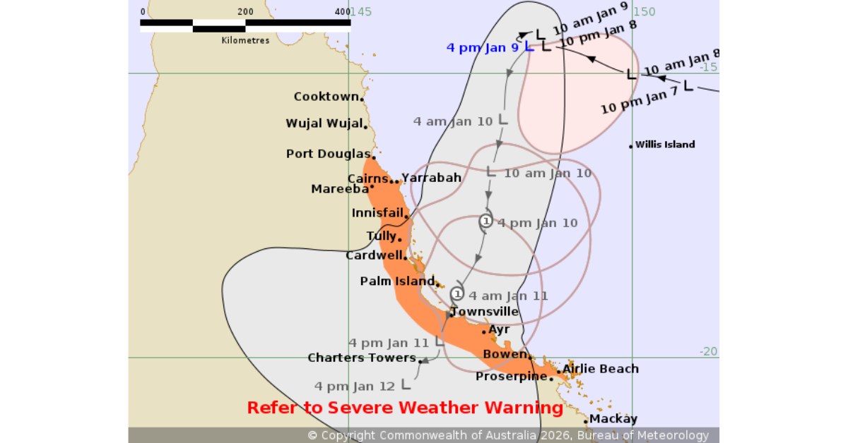 1月9日から11日にかけて、サイクロンがQLD州北西部海岸沿いエリア(Cairns/Townsville/Mackay)に接近する見込みであり、周辺エリアにおいては豪雨及び突風による被害発生が予想されます。