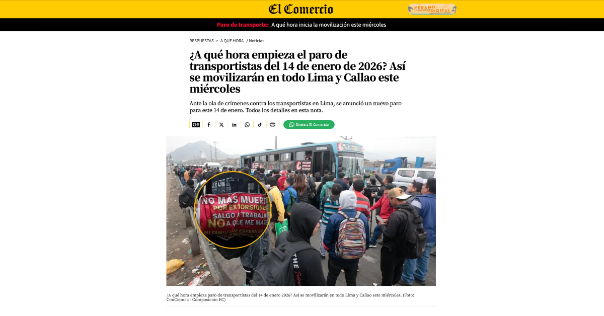 報道等によれば、2026年1月14日(水)、リマ市及びカヤオ市内において、治安改善をペルー政府に訴えることを目的としたデモの実施が想定されます。この種のデモは今後断続的に長期化する可能性があります(デモの時間やルートは不明)。