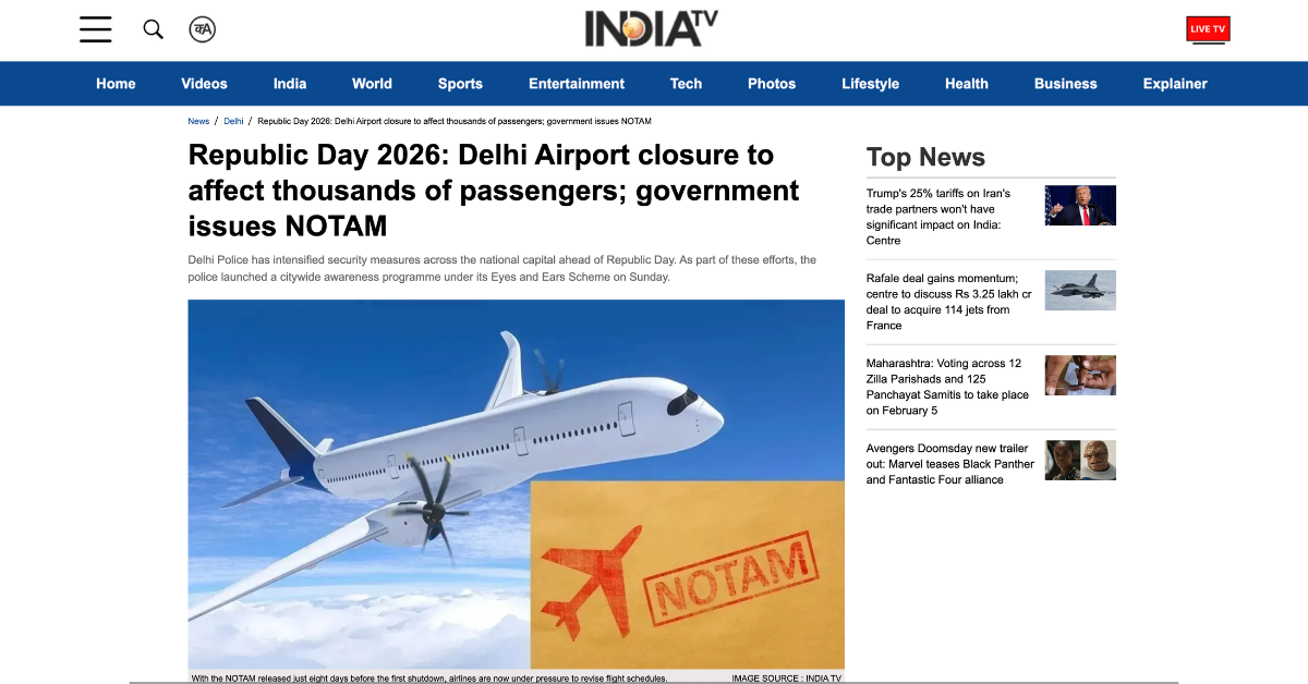 このため、1月21日から26日のまでの間にデリー空港を離発着する一部の便に、時刻変更や欠航等の影響が出ることが予想されます。