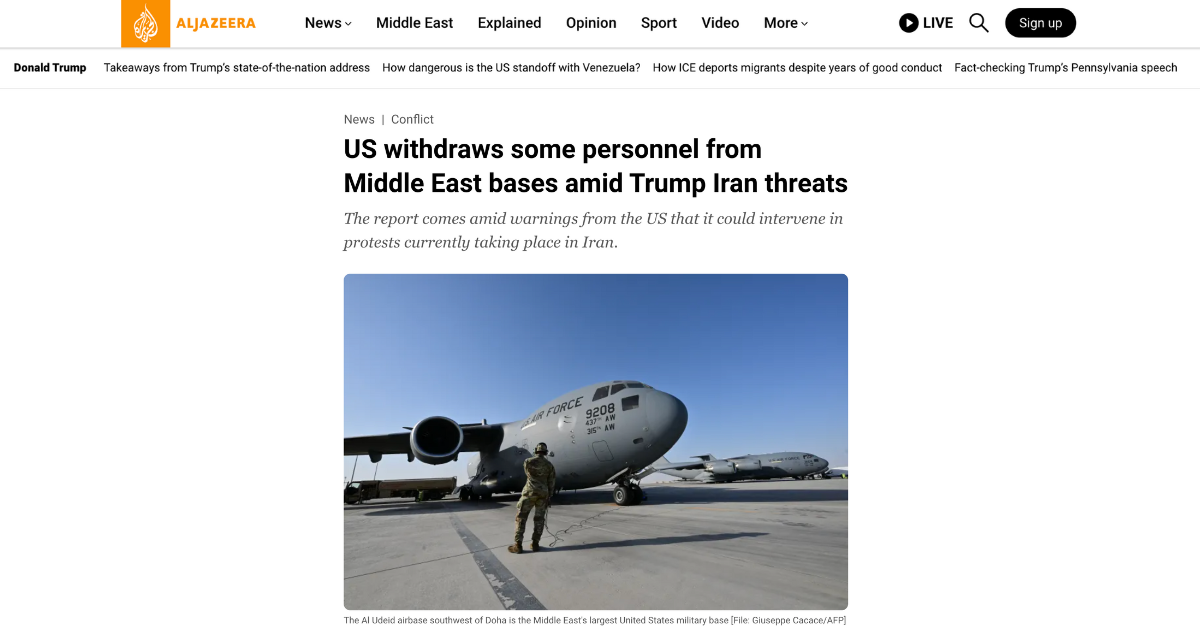 2026年1月14日、報道によれば、アル・ウデイド空軍基地から一部の人員に対し、退去するようにとの指示がなされており、カタール国際メディアオフィス(IMO)も、右は地域情勢の緊迫化を受けた措置と認め、カタール政府は市民や在留者の安全保護、また重要インフラや軍事施設の安全に万全を期しているとの声明を発出しています。