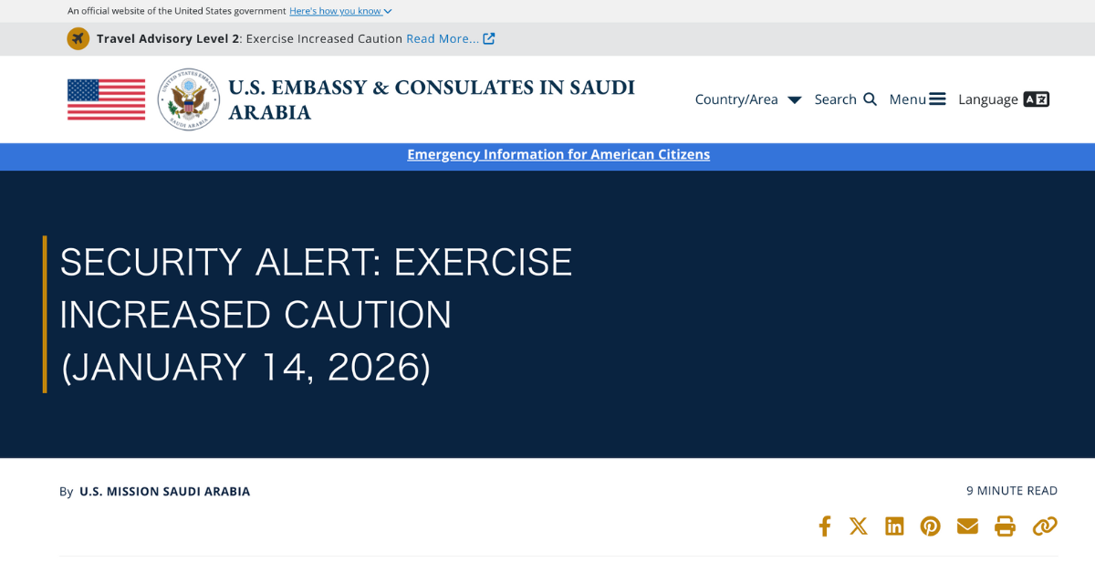 - 地域間の緊張が続く中、在サウジアラビア米国大使館は、同地域の軍事施設への不必要な訪問を制限し、より慎重な行動を心掛けるよう要請します。