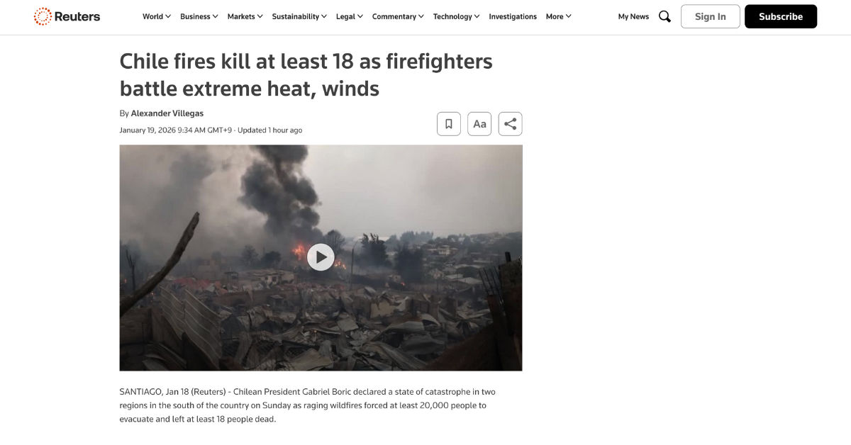 1月18日、チリ政府は、ビオビオ州及びニュブレ州において大規模な森林火災が発生していることを受け、当該地域に非常事態宣言を発出しました。