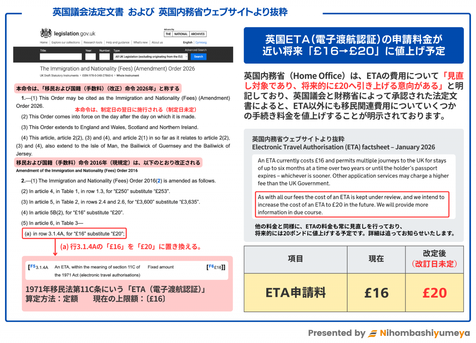 イギリス内務省(Home Office)ウェブサイトでは、ETAの費用について「見直し対象であり、将来的に£20へ引き上げる意向がある」と明記しています。