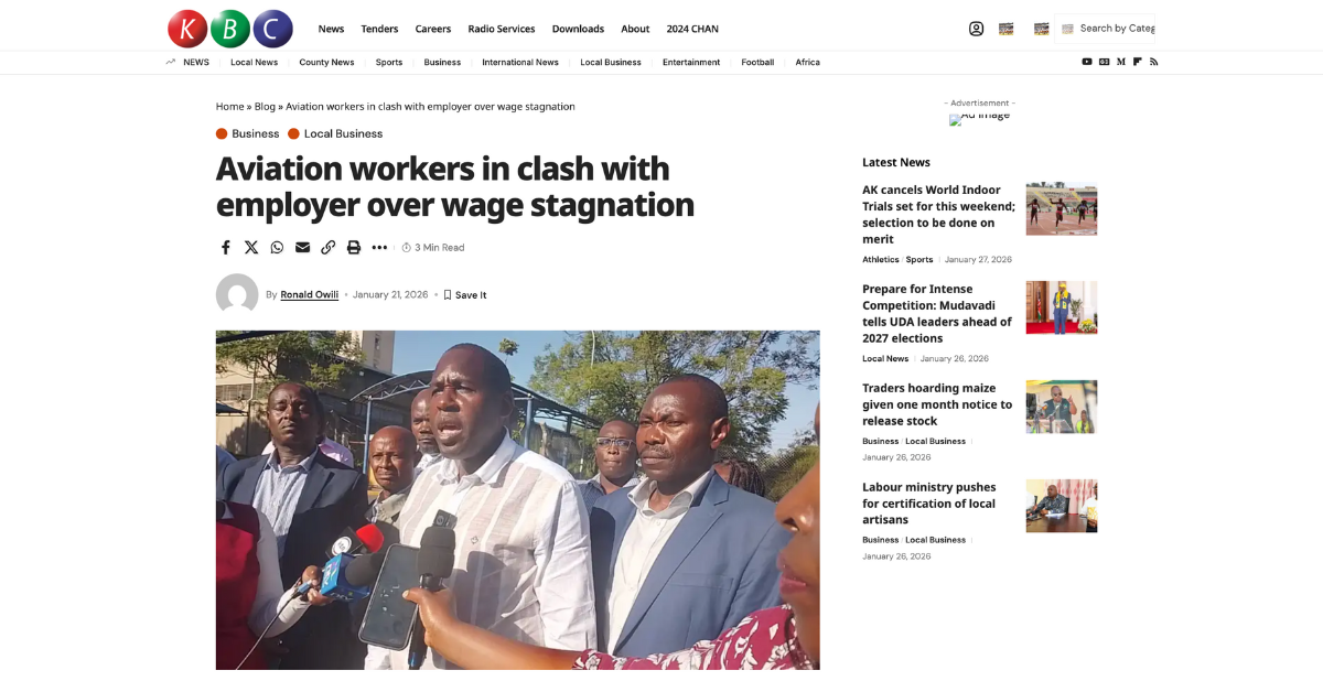 2026年1月20日(火)、ケニア空港労働組合とケニア政府及びケニア民間航空局との間の賃上げ交渉が決裂したことを受け、ケニア空港労働組合は、7日以内に交渉に進展が見られない限り、ケニア国内のすべての空港においてストライキを実施する旨表明しました。