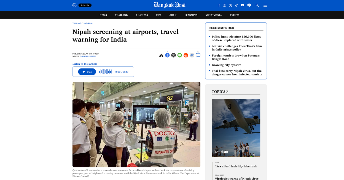 ニパウイルスの発生を受け、例えばタイでは主要空港において検疫体制を強化しているという情報もあります。今後も他国でも検疫強化の可能性がありますので、国外渡航を予定されている方におかれましては、事前に渡航先における情報収集も行うようにしてください。
