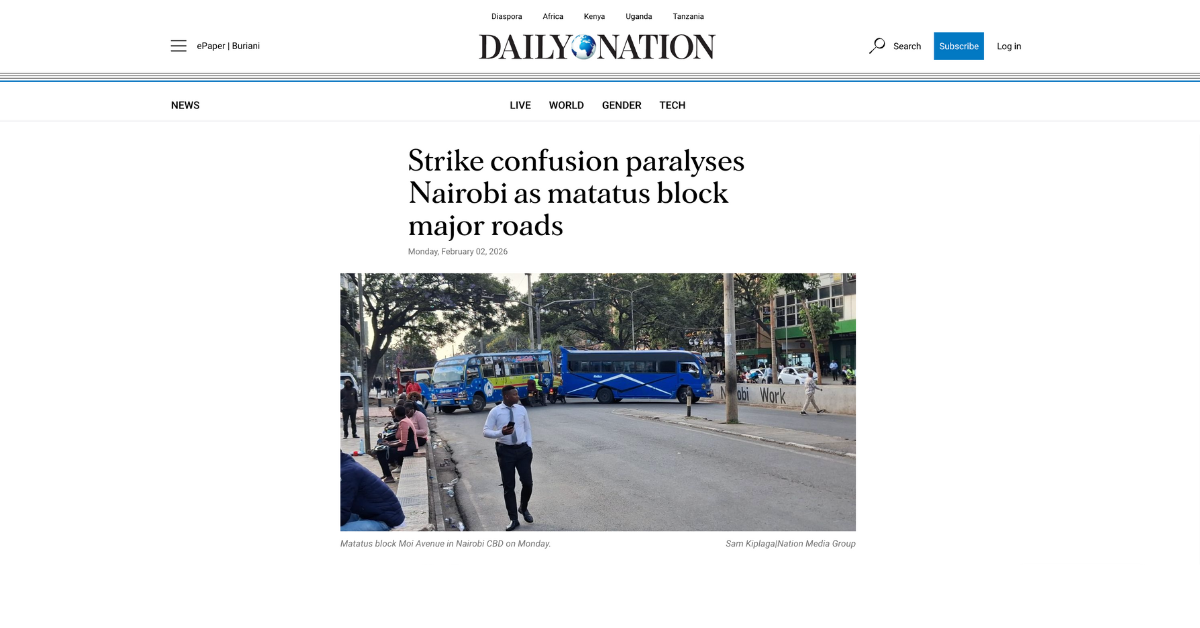 2026年2月2日、ナイロビ市内CBD地区、ティカロード及びワイヤキウエイなどの主要道路において、政府の対応に抗議する一部の公共交通機関関係者(マタツ事業者)によるデモが行われ、道路封鎖など一時的に交通の混乱が生じる事態が発生しました。