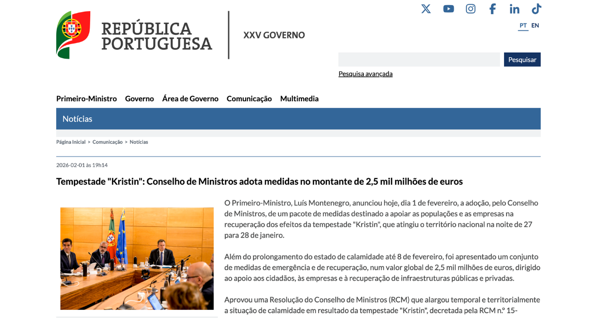 2026年2月1日、低気圧「クリスティン」への対応に関して、ポルトガル政府は2月1日までとしていた災害事態宣言を2月8日まで延長することを発表しました。