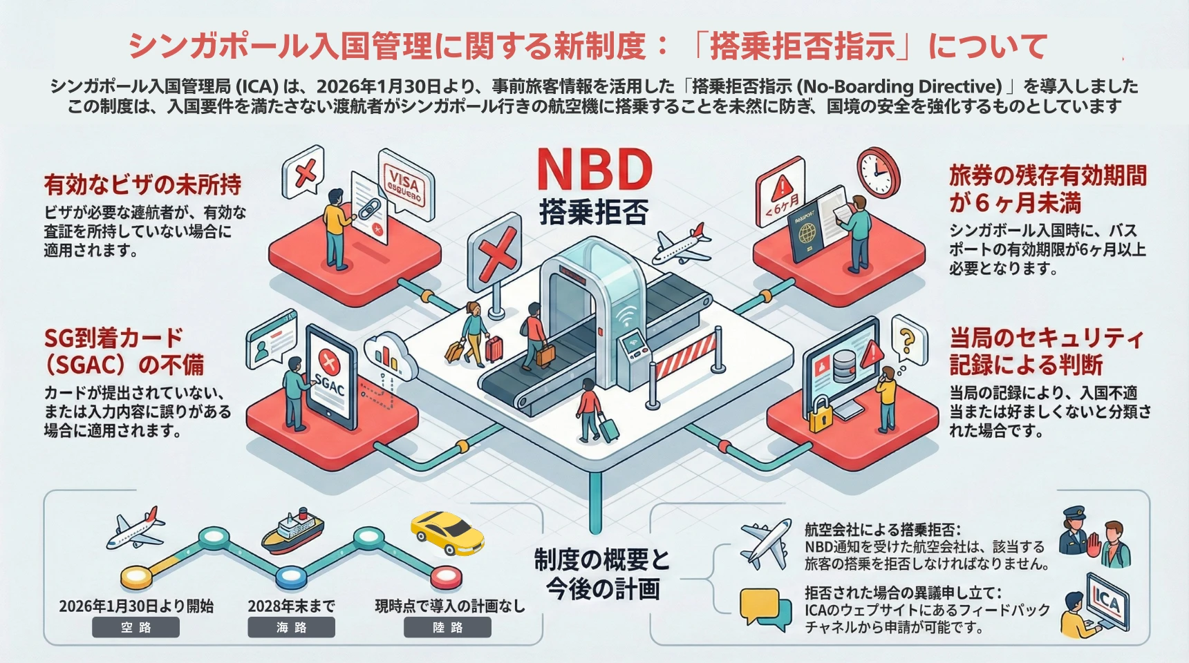 シンガポール入国管理局(ICA)は、国境警備の強化 および 入国手続きの円滑化を目的として、2026年1月30日より新たなスクリーニング制度「搭乗拒否指示(No-Boarding Directive: NBD)」を導入しました。