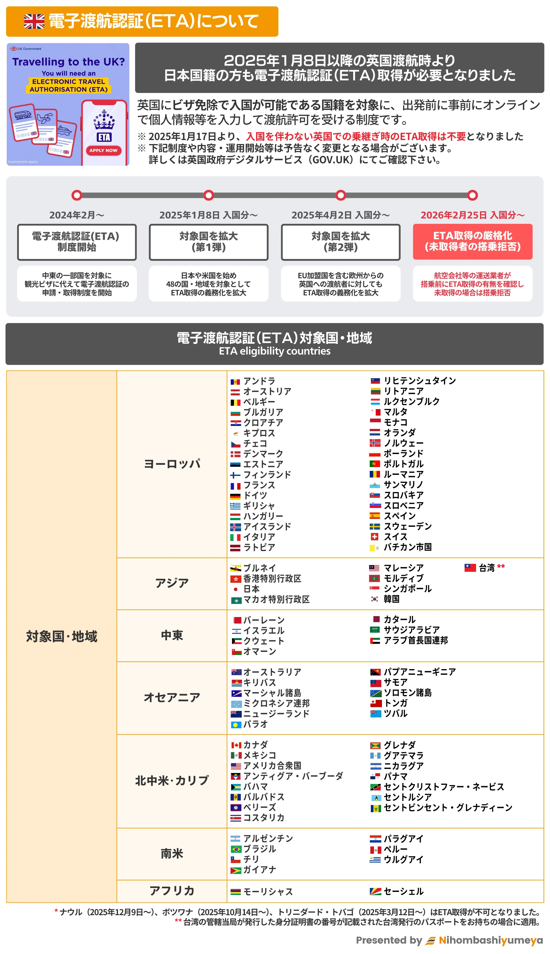 (ETA制度やETA登録が必要な渡航者の詳細は、https://www.gov.uk/eta でご確認ください)