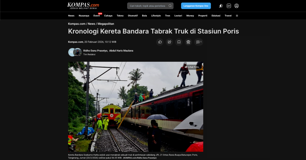 報道等によれば、20日(金)朝、ジャカルタ市内マンガライ駅発ジャカルタ・スカルノハッタ空港行電車が、ポリス駅とバトゥチェペール駅の間で、大型トラックと衝突する事故が発生しました。現在までの情報では、死傷者はいない模様です。