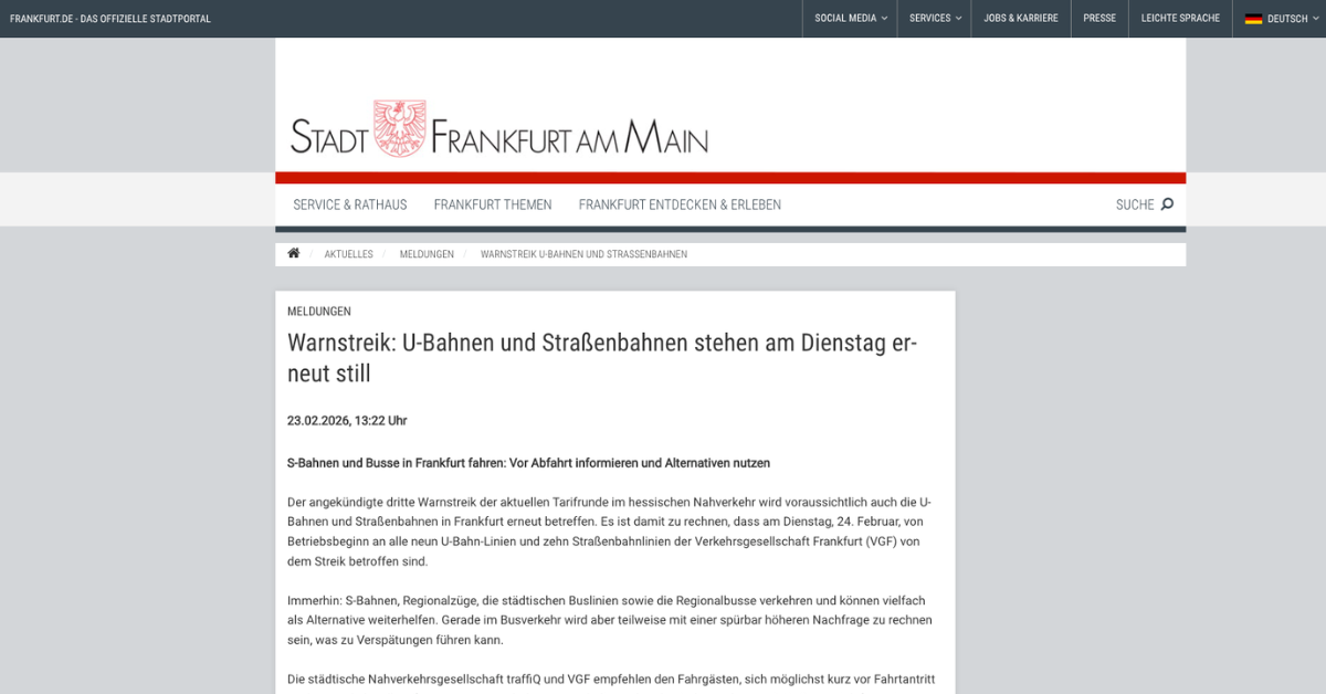 2026年2月24日(火)、フランクフルト、ヴィースバーデン、ギーセン、マールブルク、カッセルで警告ストライキが行われます。
