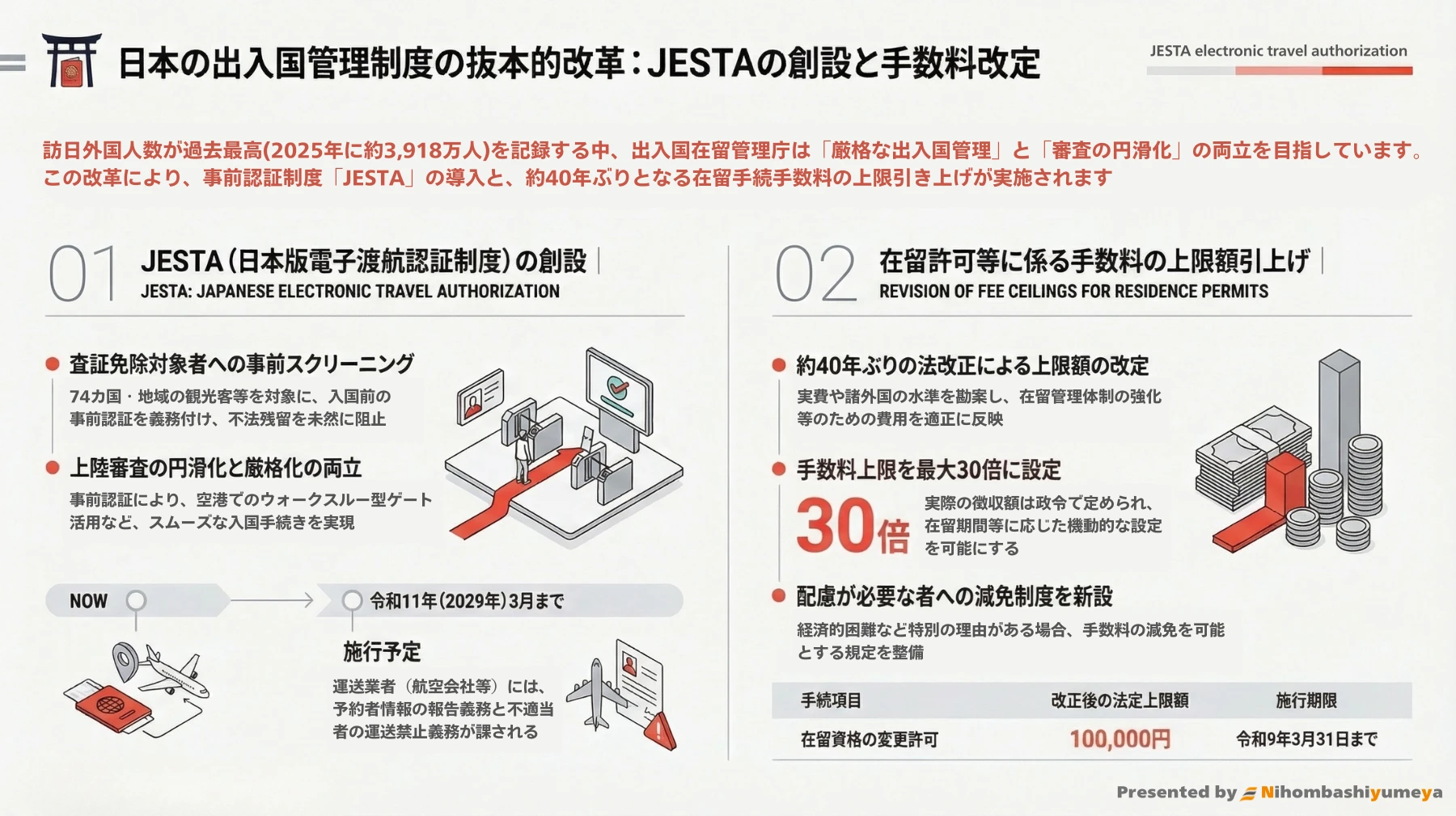 この改正案には、米国のESTA(電子渡航認証システム)を参考にした 電子渡航認証制度「JESTA(Japan Electronic System for Travel Authorization)」の導入と、在留資格の変更・更新・永住許可に係る手数料の法定上限額の大幅な引き上げが盛り込まれています。法案は衆議院に提出され、今国会での成立を目指しています。