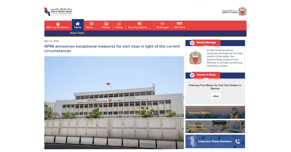 バーレーン内務省傘下の国籍・パスポート・居住管理局(NPRA)は2026年3月12日、中東情勢の緊迫化に伴う空域閉鎖およびフライトのキャンセル・運休により出国・入国が困難になった旅行者を対象に、訪問ビザに関する特例措置を発表しました。この措置は大きく2つに分かれており、バーレーン国内に滞在中でオーバーステイとなった旅行者への罰金免除と、国外にいてビザを使用できなかった旅行者へのビザ有効期間の3か月延長が含まれています。