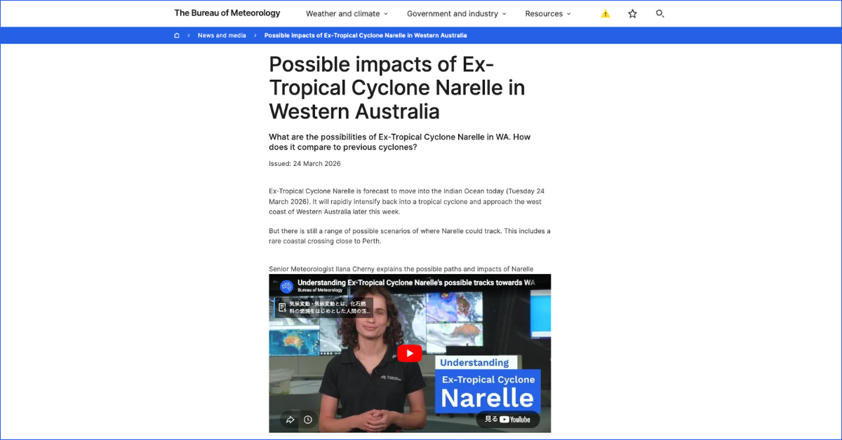 また、オーストラリア気象局発令の警告ゾーンにポートヘッドランド国際空港(PHE)、カラサ空港(KTA)などが含まれており、パース空港(PER)についても、週末にかけてサイクロンが南下する可能性があるため、フライトへの影響が懸念されます。航空便の最新状況は各航空会社(Qantas・Virgin Australia・Rex等)の公式サイト、および各空港の運航情報を随時ご確認ください。