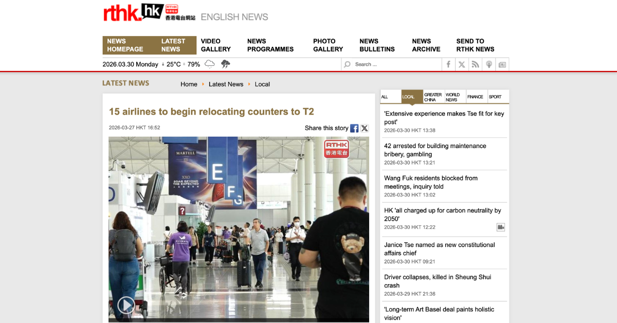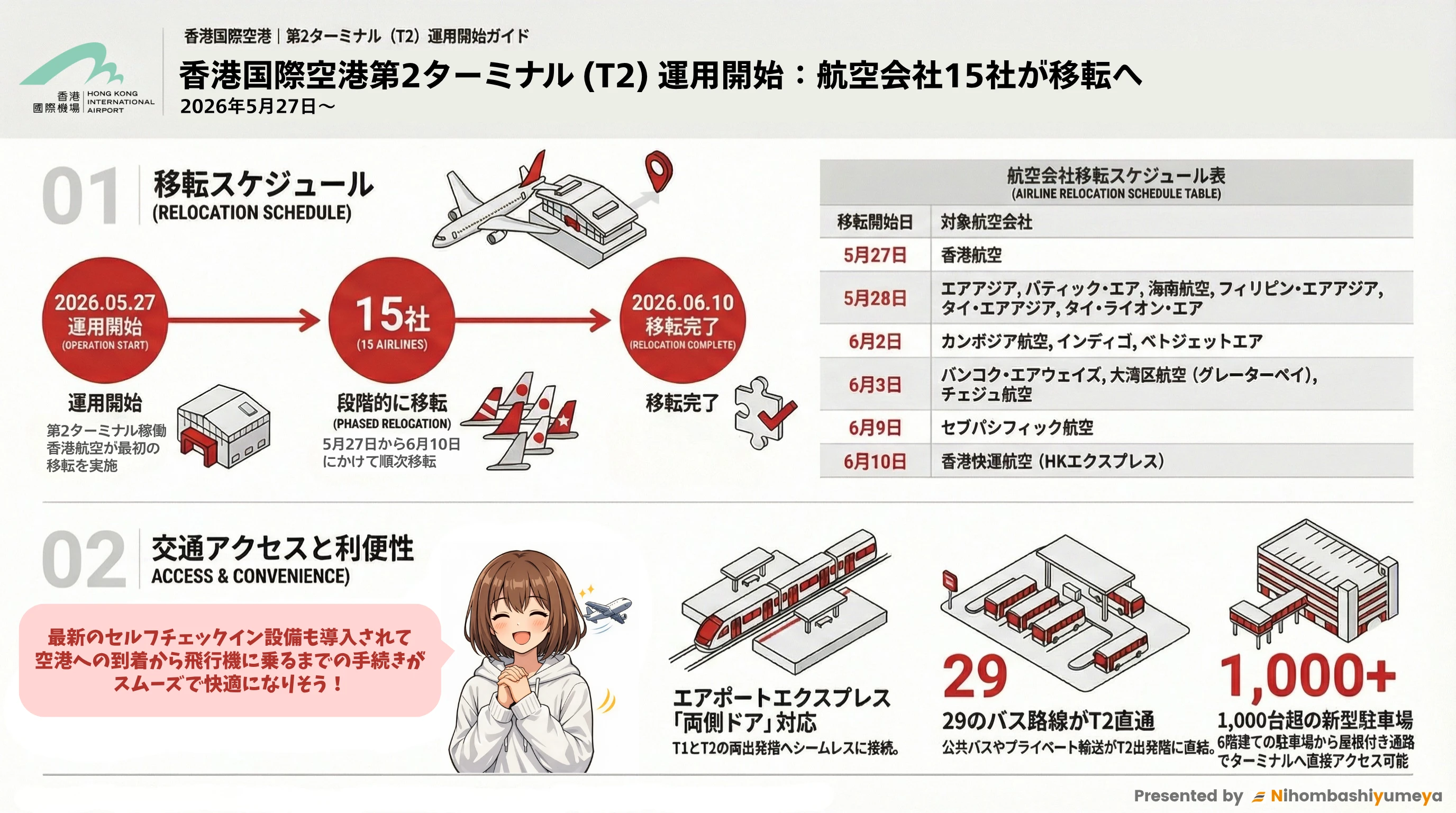 これに伴い、香港航空・グレーターベイ航空・香港エクスプレスを含む15の航空会社が、チェックインカウンターを第1ターミナル(T1)から第2ターミナル(T2)へ段階的に移転します。移転作業は夏の旅行ピーク前の2026年6月10日までに完了する予定です。