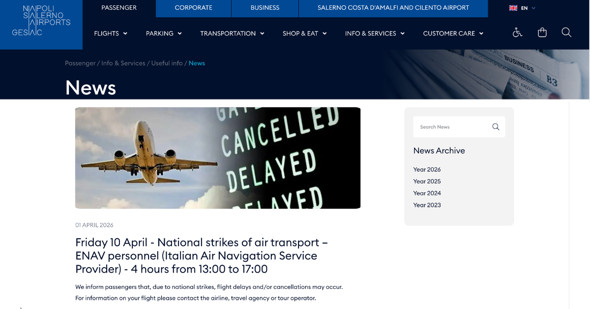 これに伴い、ローマ・フィウミチーノ空港(FCO)、ミラノ・マルペンサ空港(MXP)、ナポリ・カポディキーノ空港(NAP)をはじめとする全国主要空港の航空交通管制業務に影響が生じる可能性があります。また、同日同時間帯には、ローマ・フィウミチーノおよびチャンピーノ空港(CIA)で保安検査要員もストライキを実施するとしています。