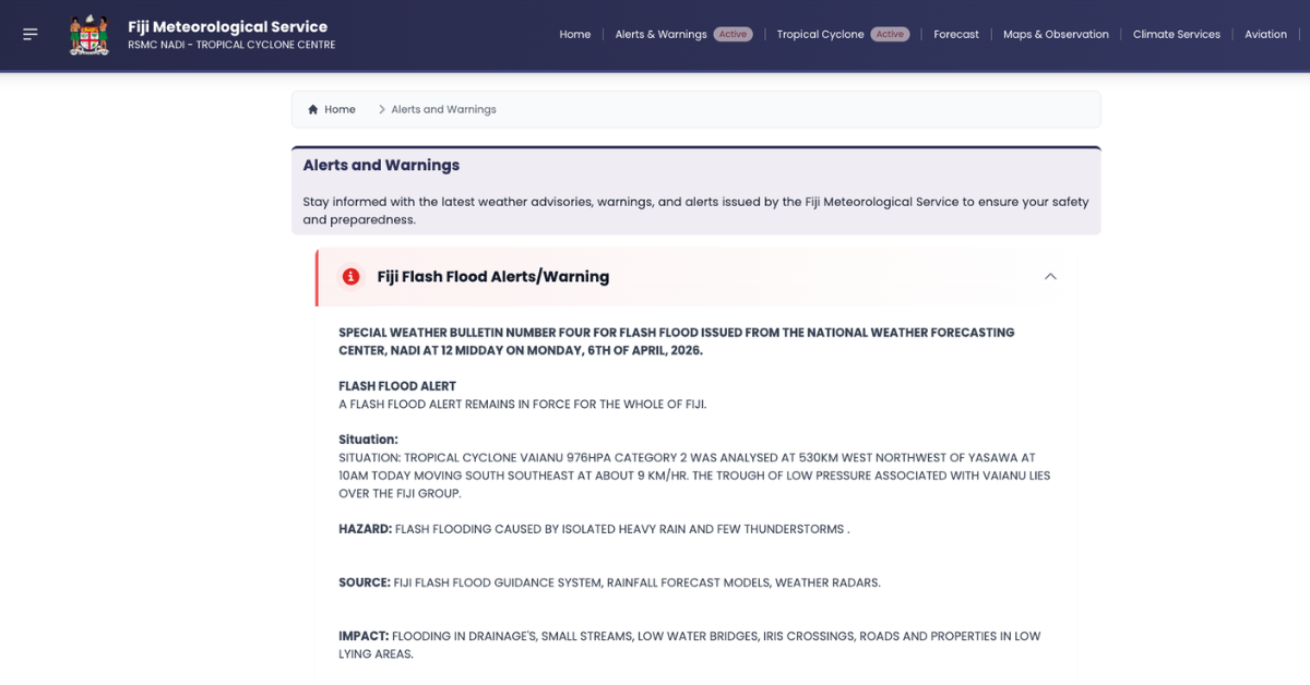 フィジー気象局が発出する警報・注意報等の最新情報は、以下のリンクからご確認いただけます。こまめな情報収集に努め、安全確保にお役立てください。