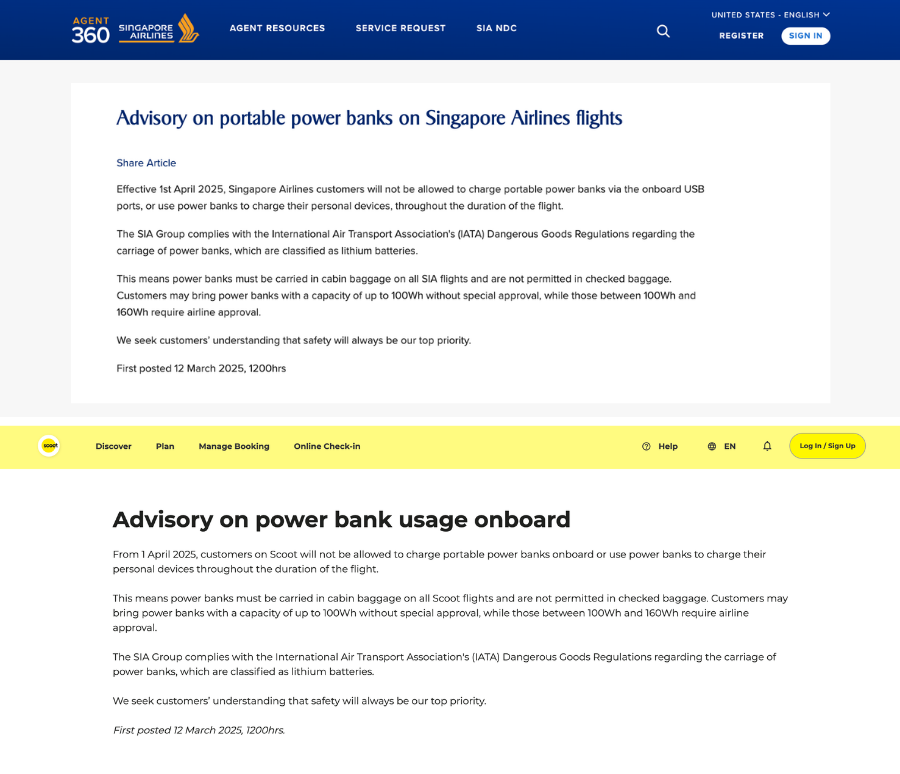今回の措置はICAO(国際民間航空機関)が2026年3月27日に採択・即日発効した安全基準改定(2個制限・機内充電禁止)を受けたものですが、シンガポール航空とスクートはすでに2025年4月1日から機内でのモバイルバッテリー使用・充電を独自に禁止しており、今回の規制はそれを国レベルで追認・拡大する形となります。