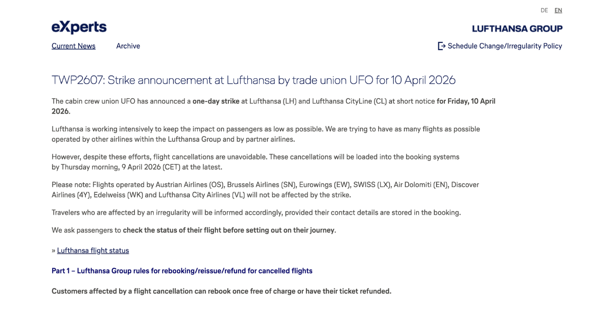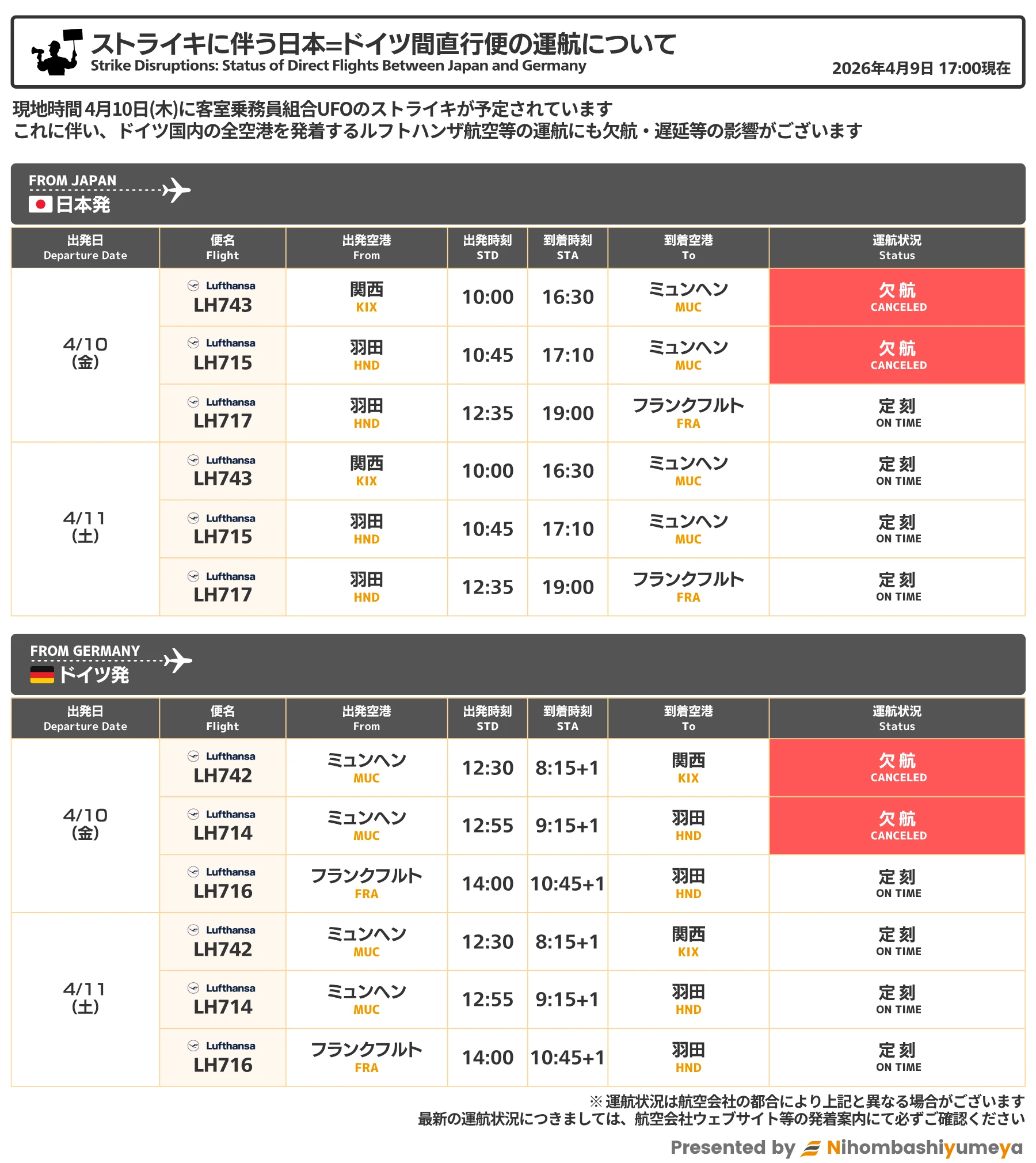 本記事に記載されている情報は、2026年4月9日現在のものであり、ストライキの実施状況、影響範囲、各社の対応等は予告なく変更される可能性があります。最新フライト状況につきましては、必ず公式サイトまたはルフトハンザ公式アプリ等にてご確認ください。