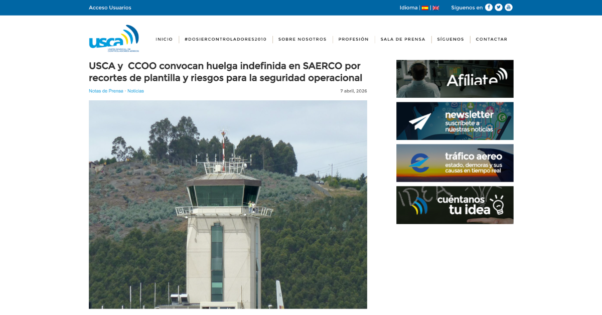スペインの民間航空管制サービス会社Saercoが管理する14の管制塔において、航空管制官組合USCA(Unión Sindical de Controladores Aéreos)およびCCOO(Comisiones Obreras)が、2026年4月17日(金)午前0時より無期限ストライキを実施することを正式に予告しています。