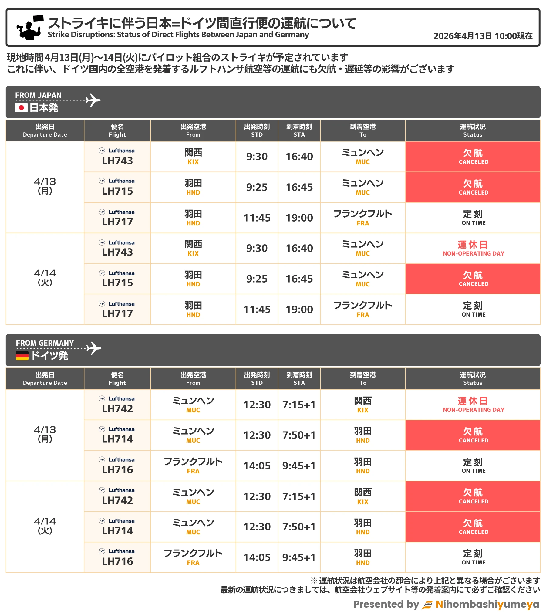 本記事に記載の情報は、記載時点(2026年4月13日)における公開情報に基づいています。ストライキの状況・運航への影響は今後随時変更される場合があります。