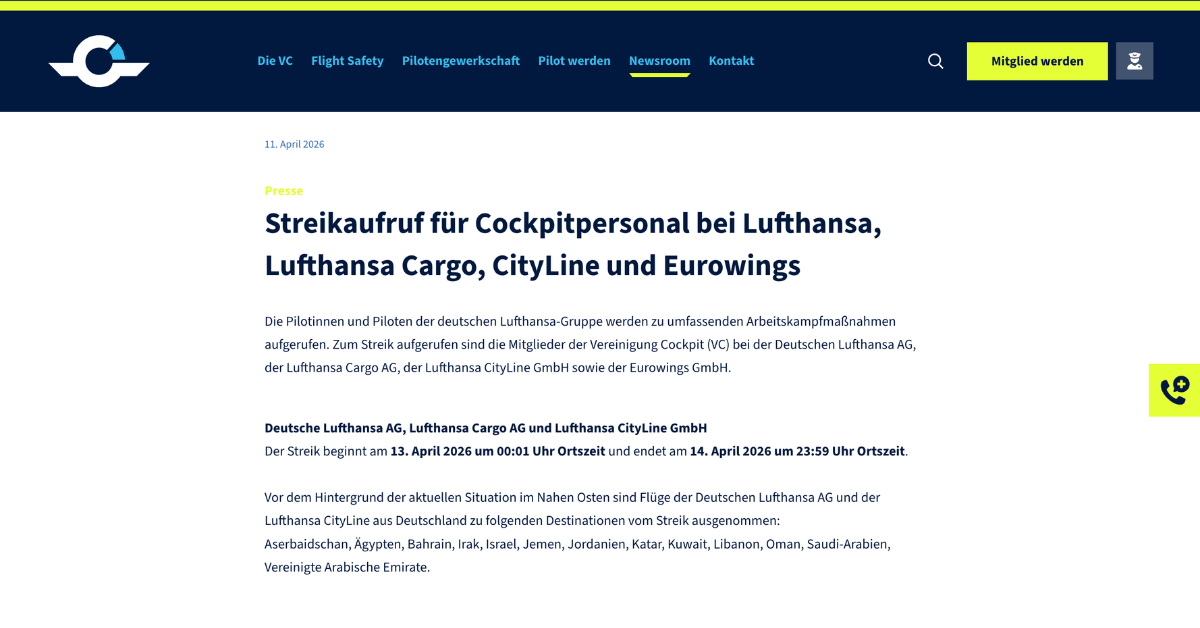 パイロット組合「Vereinigung Cockpit(VC)」は、2026年4月11日(土)、ルフトハンザ航空グループのコックピット乗務員に対し、2026年4月13日(月)00:01から4月14日(火)23:59(現地時間)にかけての48時間にわたる警告ストライキを呼びかけました。