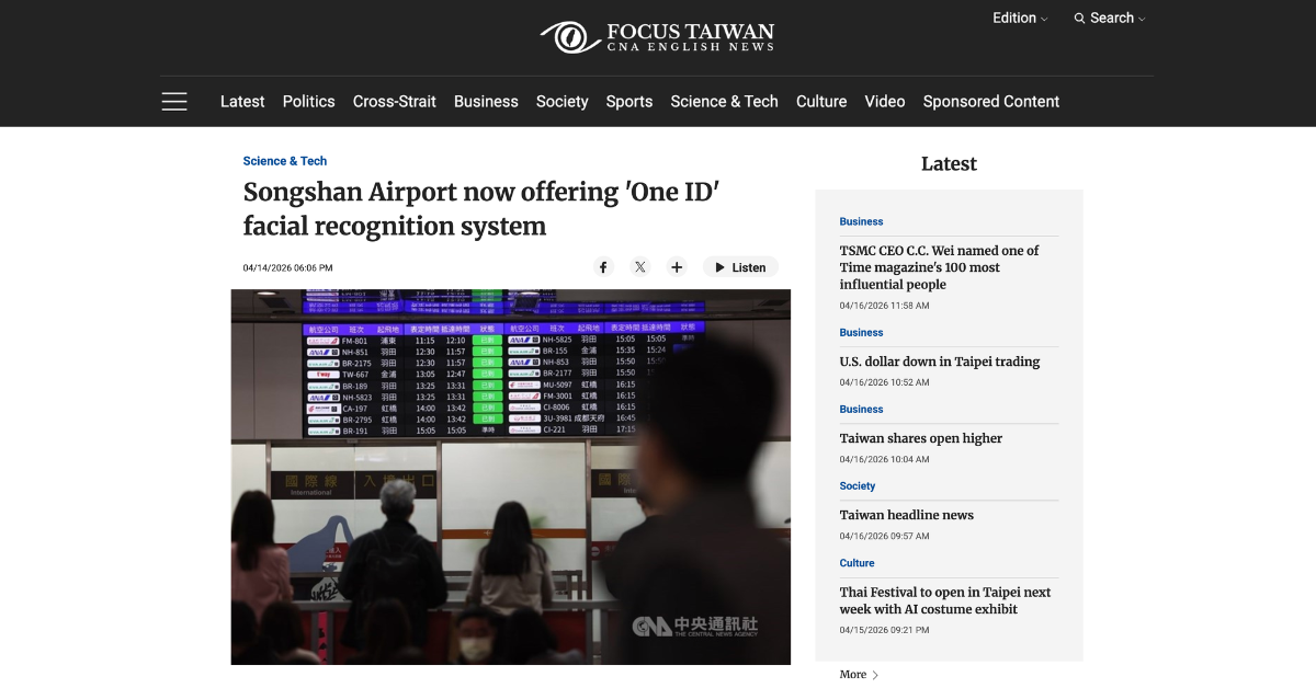 Focus Taiwan(CNA)|Songshan Airport now offering 'One ID' facial recognition system