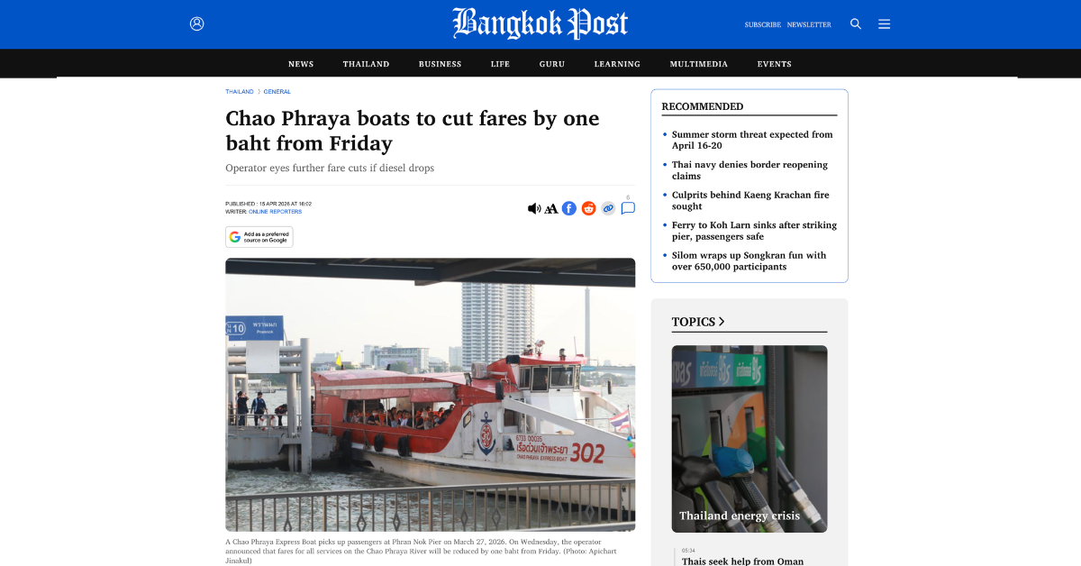 Bangkok Post|Chao Phraya boats to cut fares by one baht from Friday