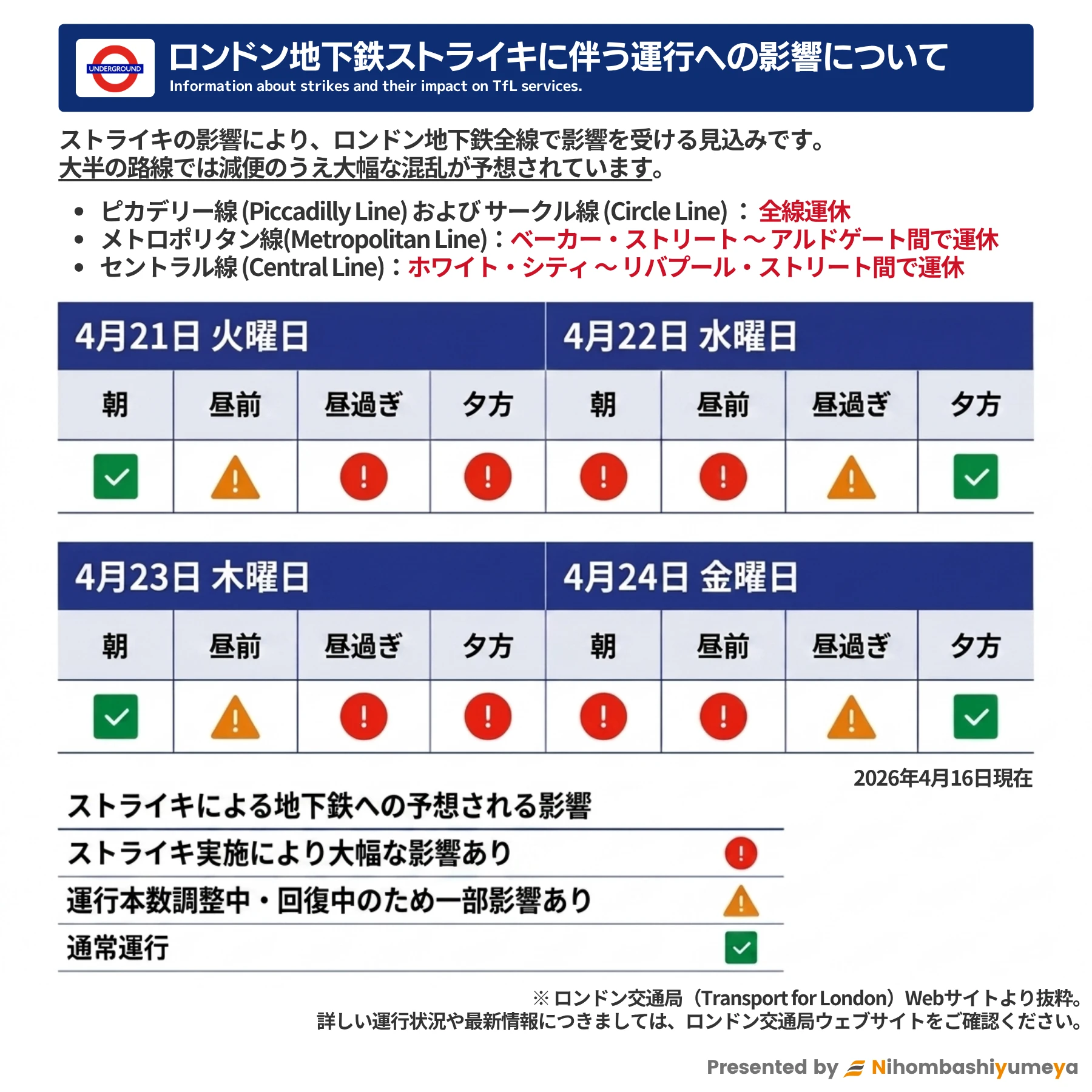 | 4月24日(金) | ロンドン地下鉄 + バスストライキ重複 |