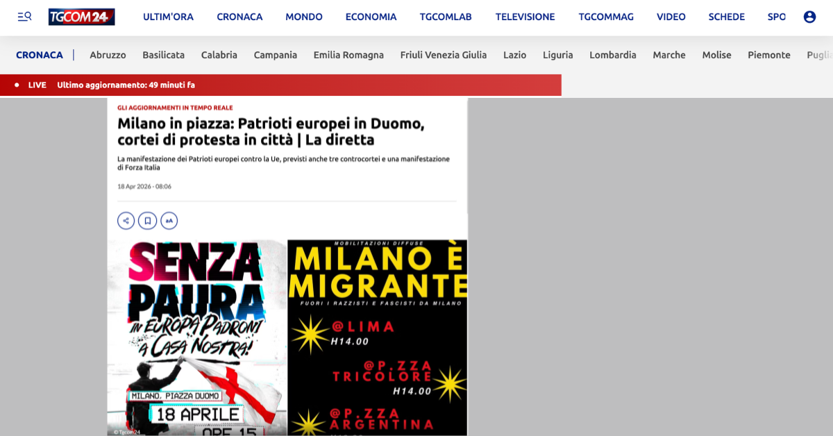 - 4月18日午後、ミラノ中心部でレーガ党および欧州パトリオット系の集会コースと、3本の反対デモが同時進行