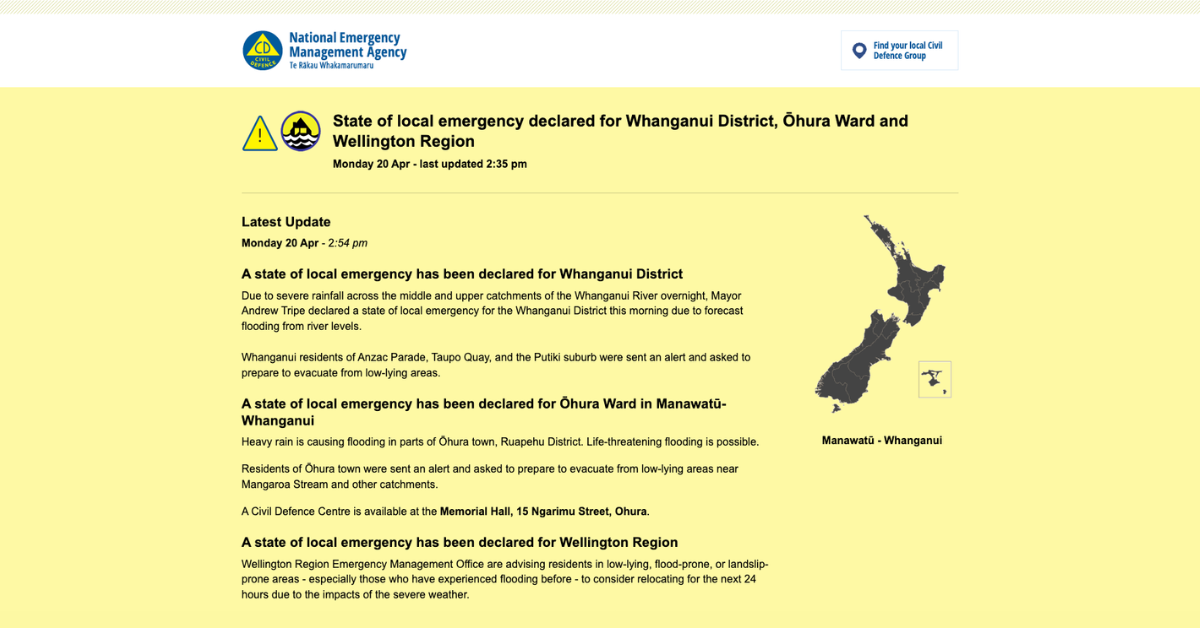 警報は4月21日(火)夜まで継続される見通しで、「河川の危険な増水・大規模な洪水・土砂崩れによる人命への脅威」と明記されています。前夜から降り続いた記録的な豪雨(1時間に77mmを観測)により、ウェリントン市南部を中心に150件以上の洪水・土砂崩れ関連の通報が相次ぎ、ウェリントン地方民間防衛緊急管理局(WCEM)は非常事態宣言を発令しました。