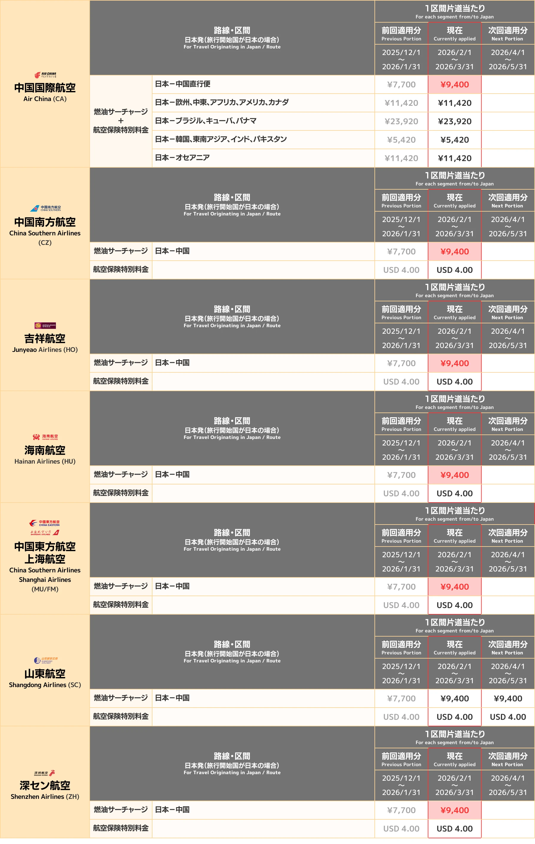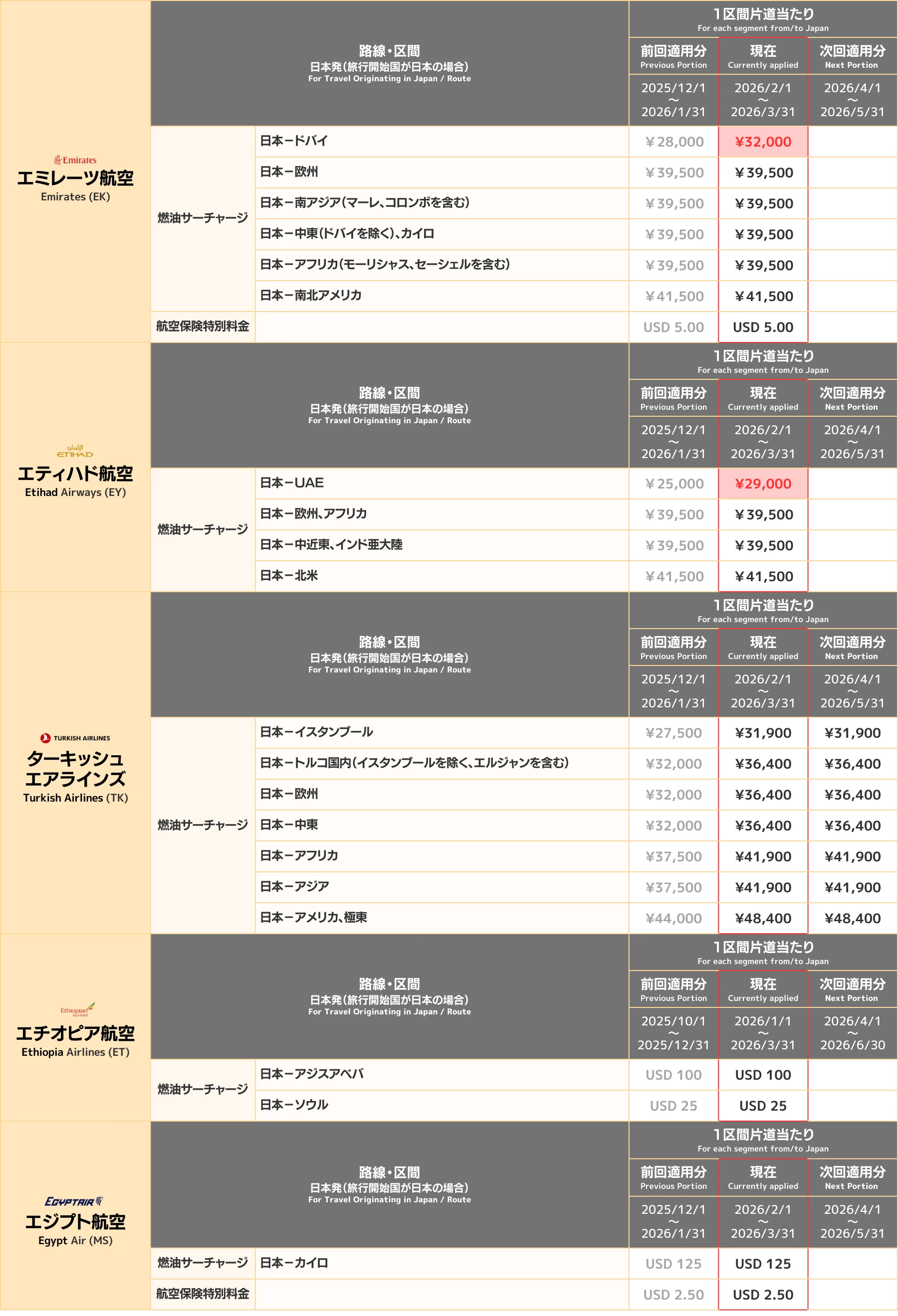 【2026年3月現在】燃油サーチャージ|航空会社別一覧 料金のご案内