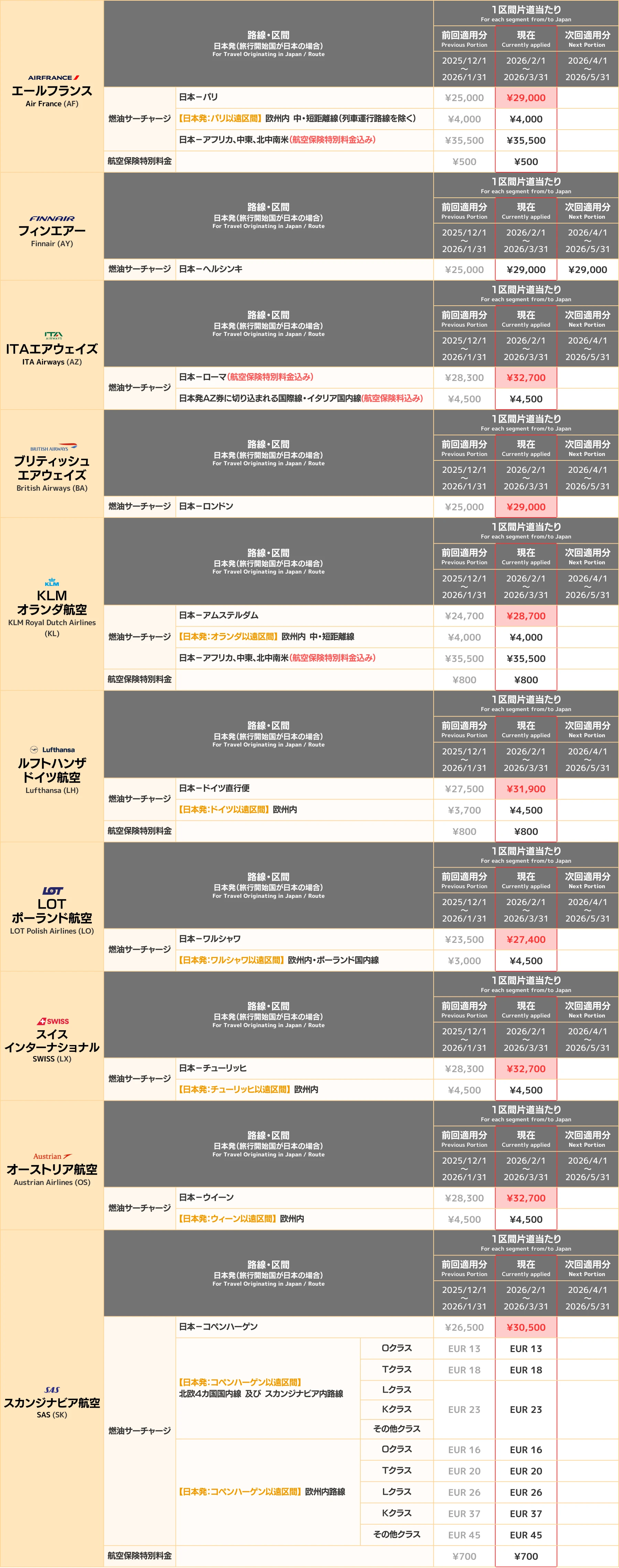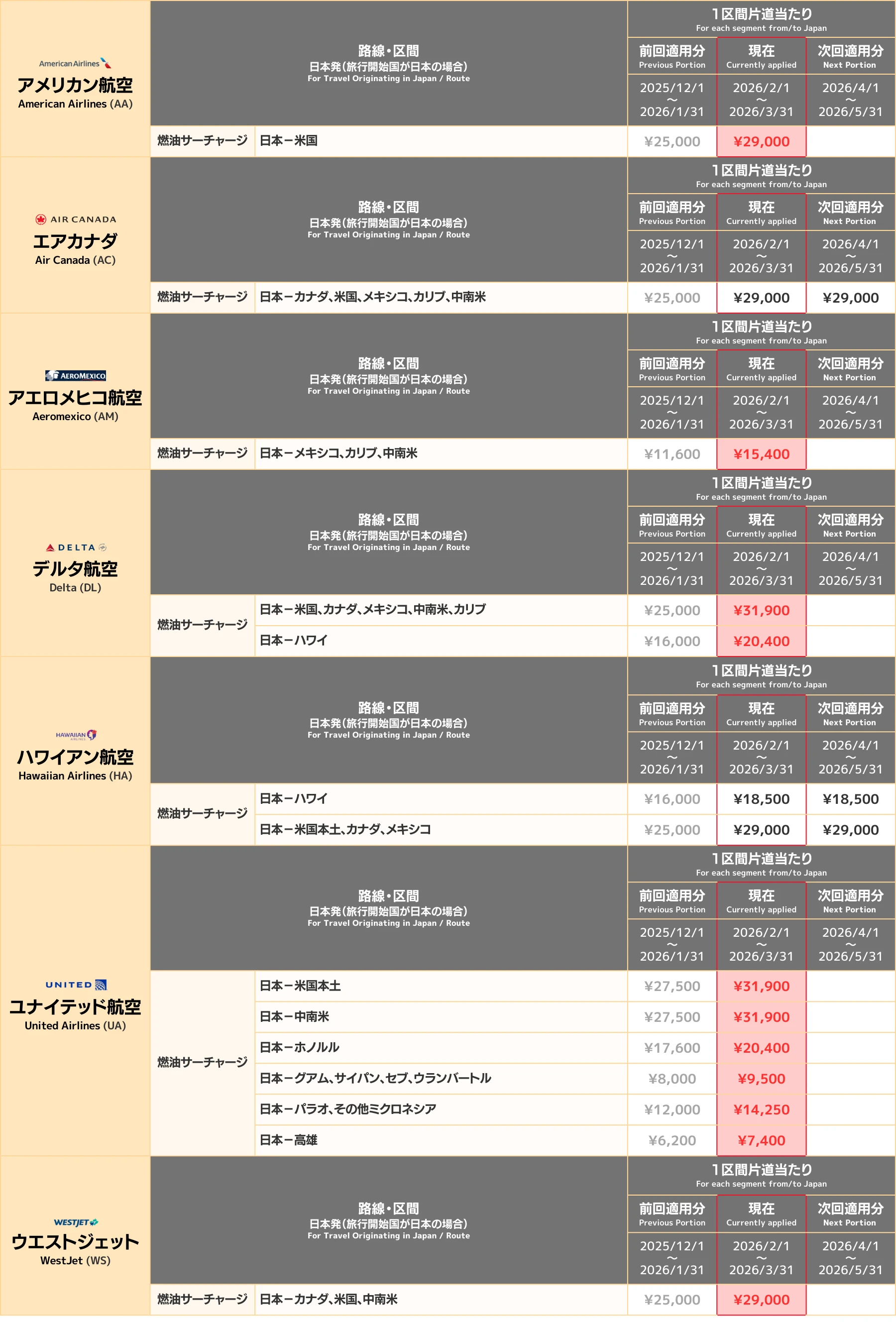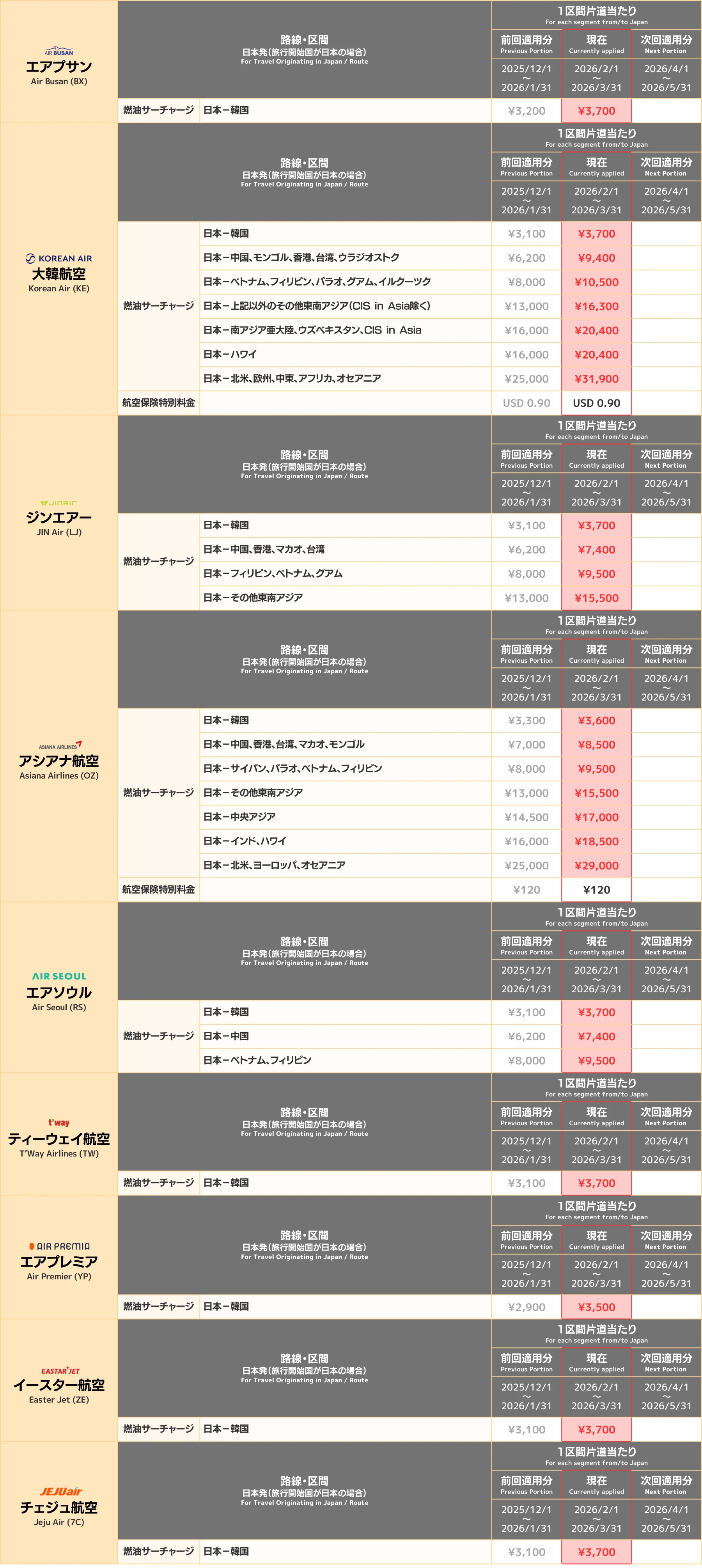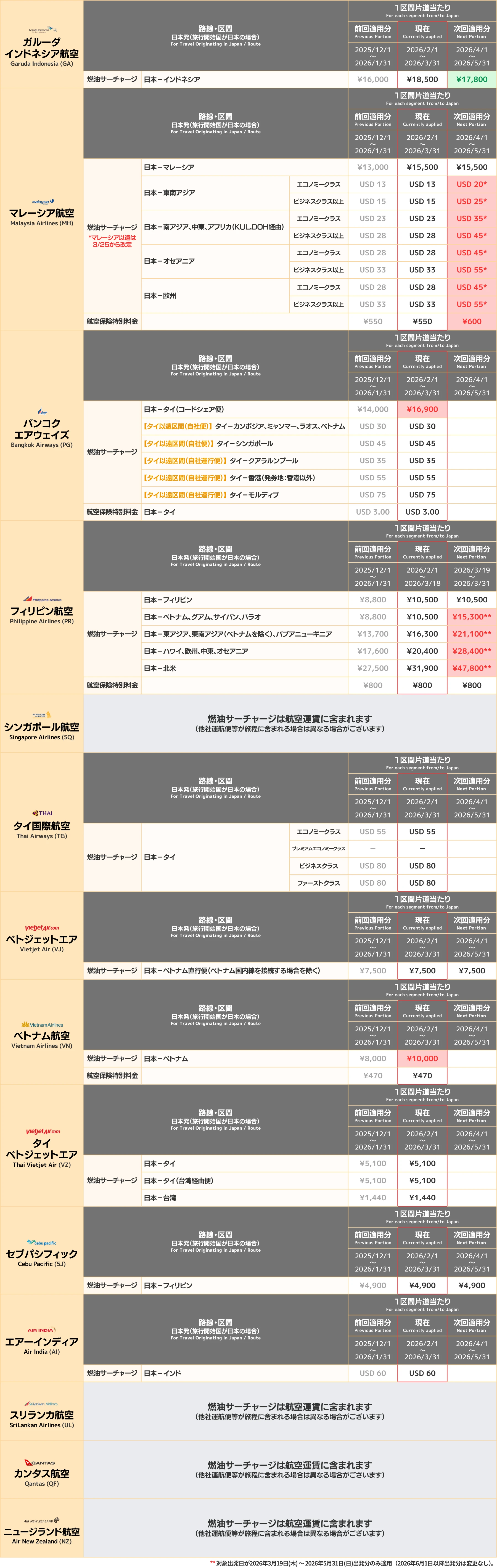 ✈ 各航空会社別の燃油サーチャージ一覧(2026年3月18日現在)