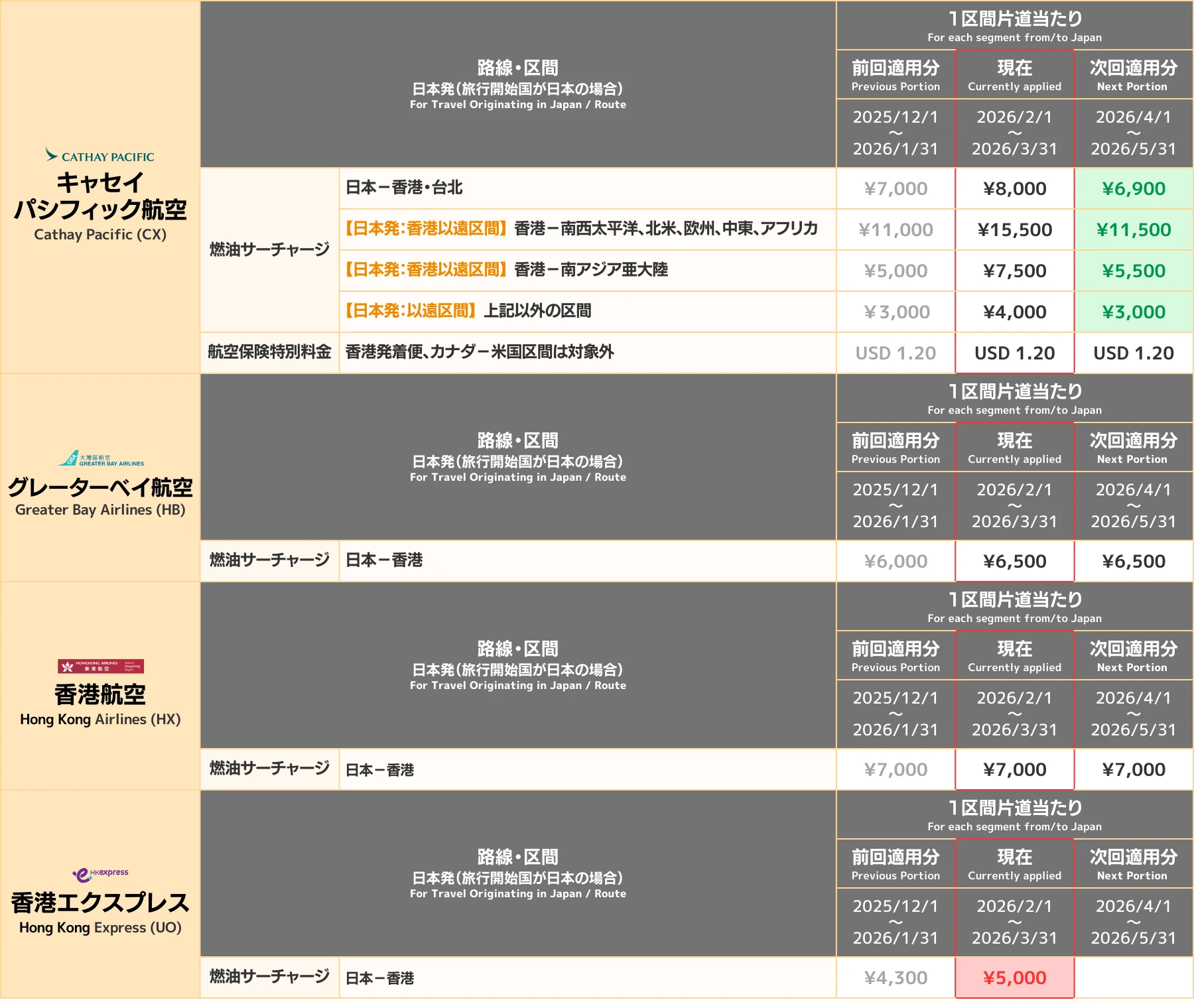 原則として日本航空(JAL)及び 全日本空輸(ANA)の燃油サーチャージは2ヶ月間固定です。