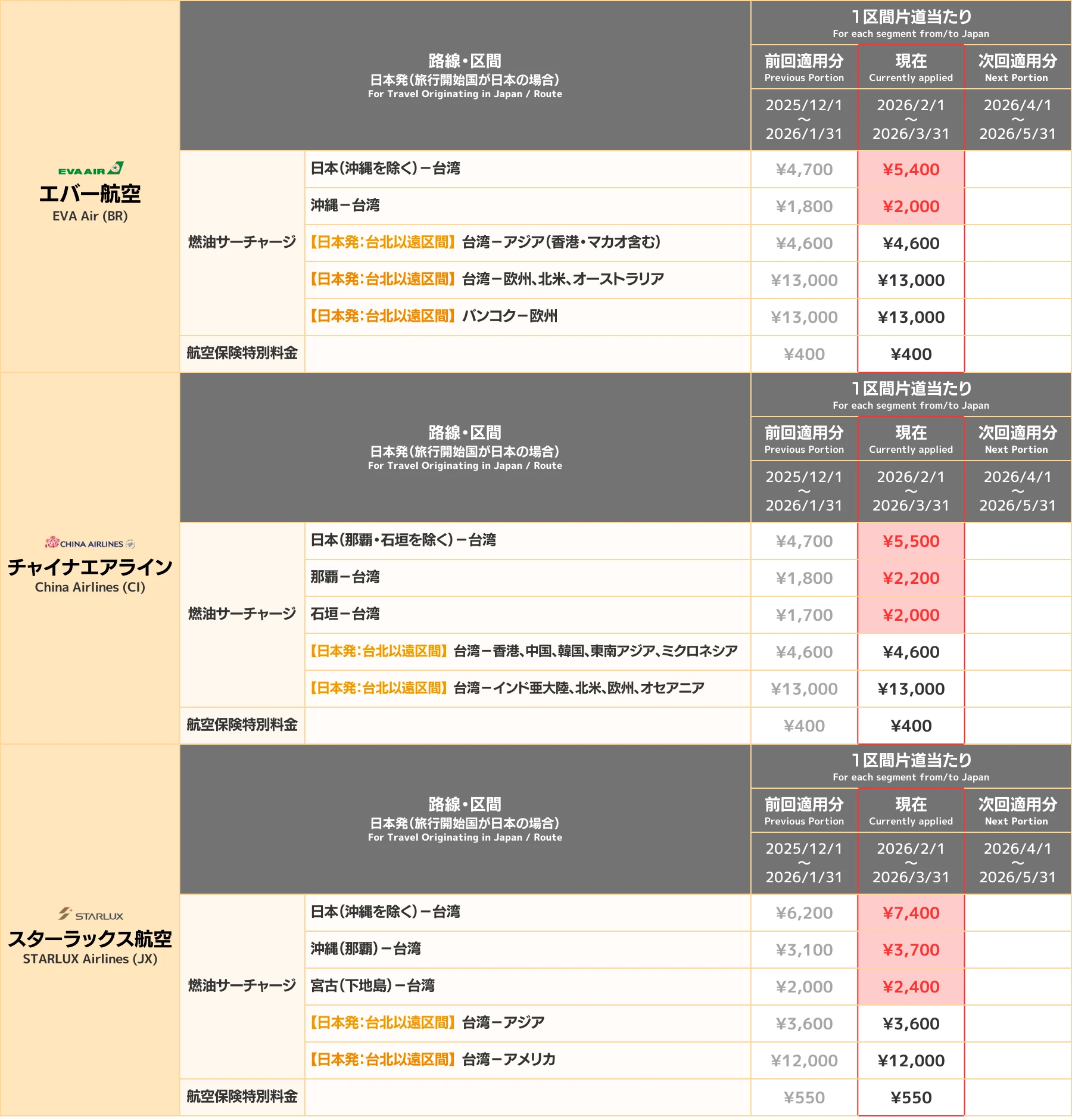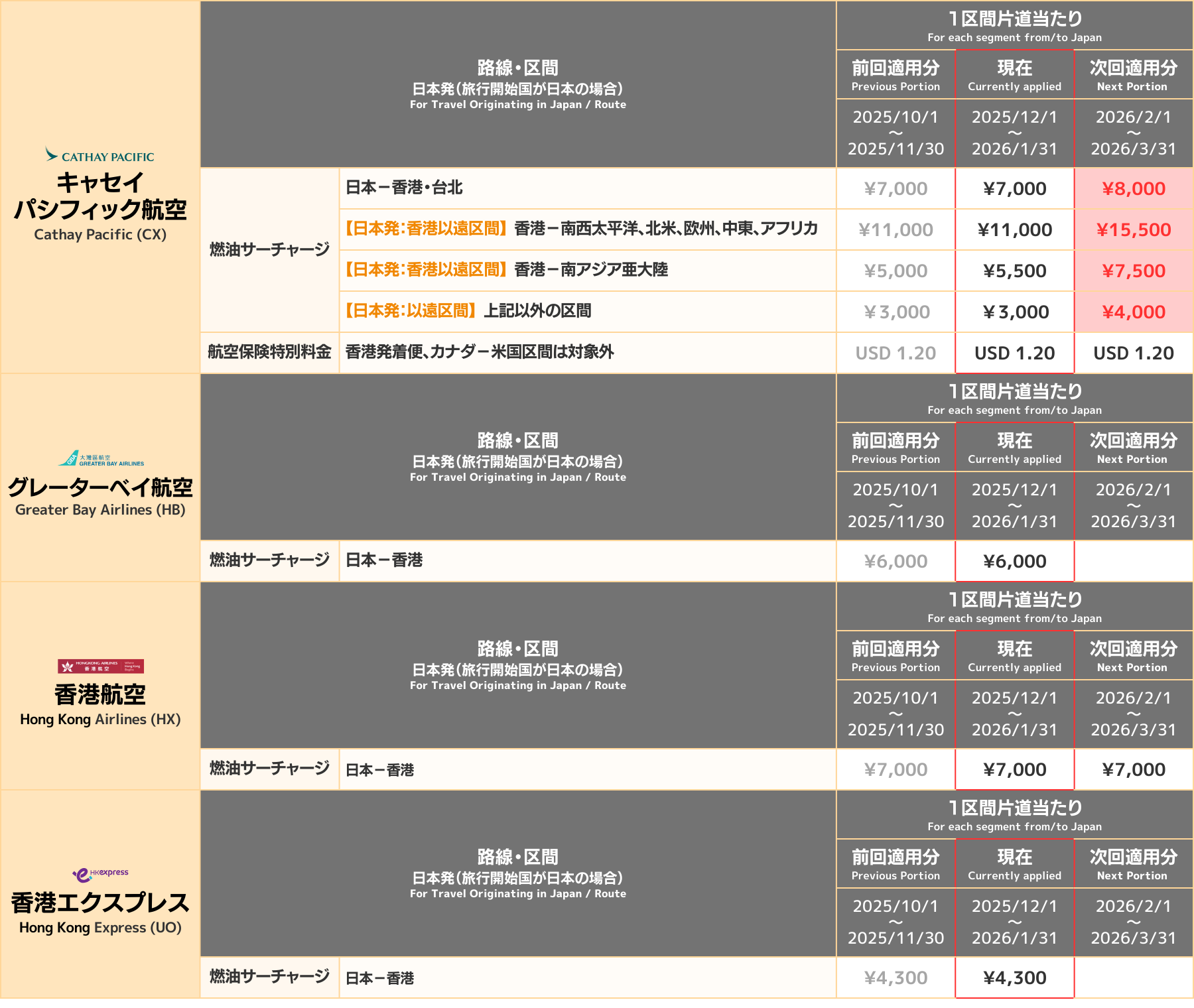 燃油サーチャージ 及び 航空保険特別料金の詳細については以下のとおりです。