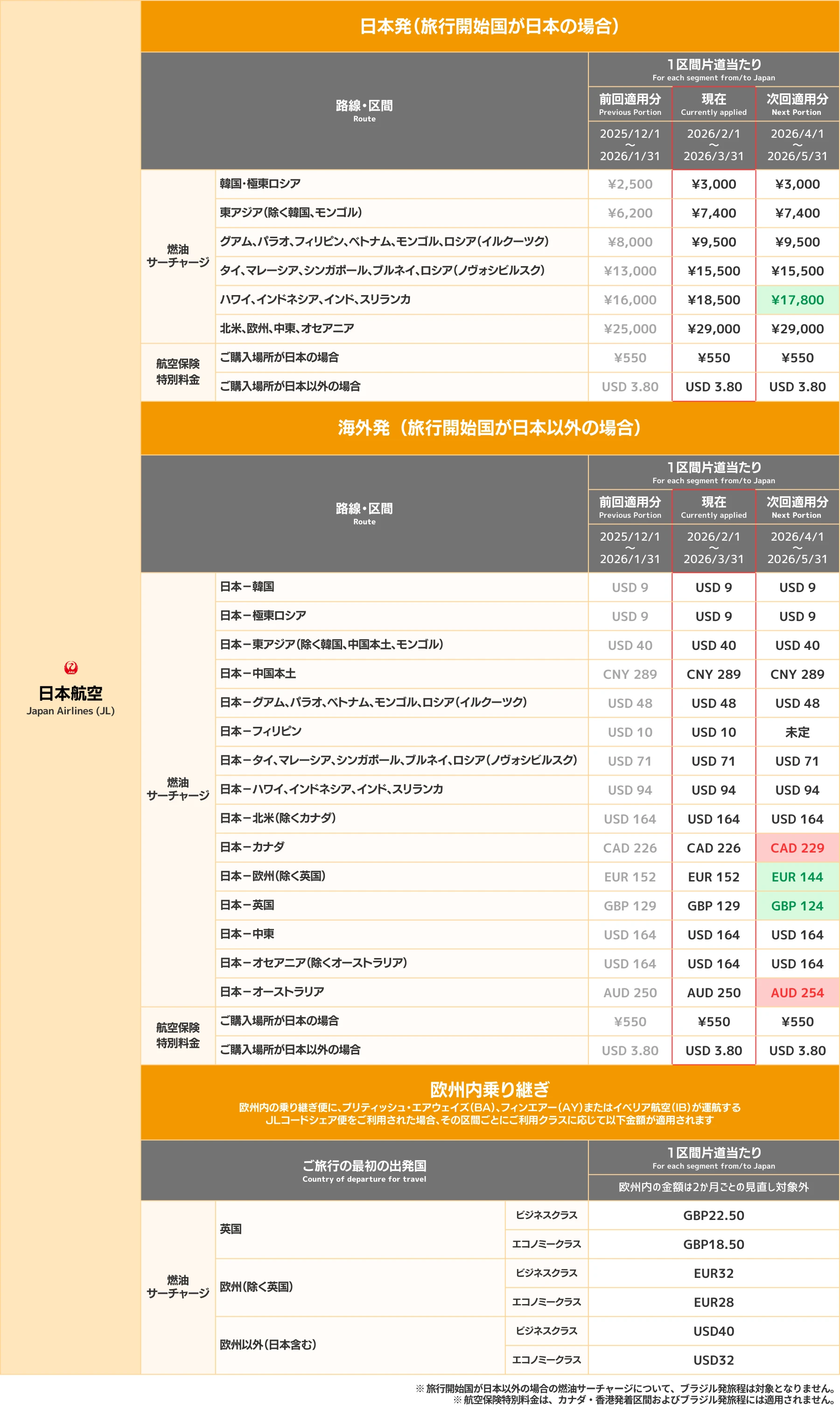 日本航空(JAL)|国際線「燃油特別付加運賃」「航空保険特別料金」のご案内