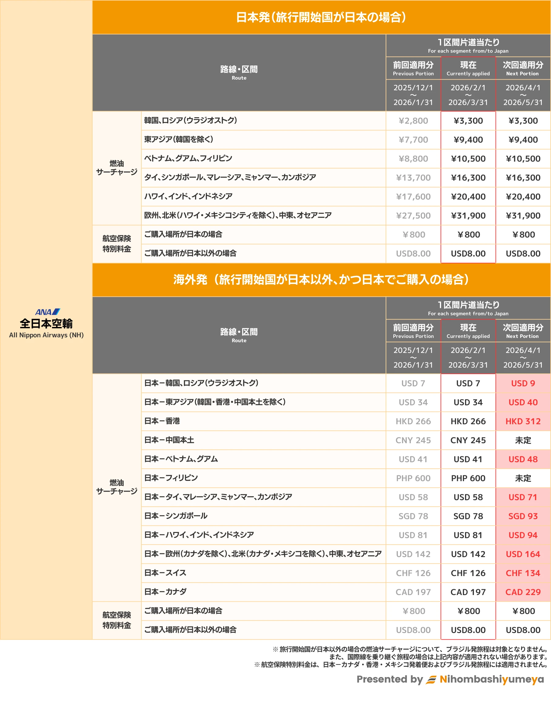 全日本空輸(ANA)|燃油特別付加運賃 / 航空保険特別料金について