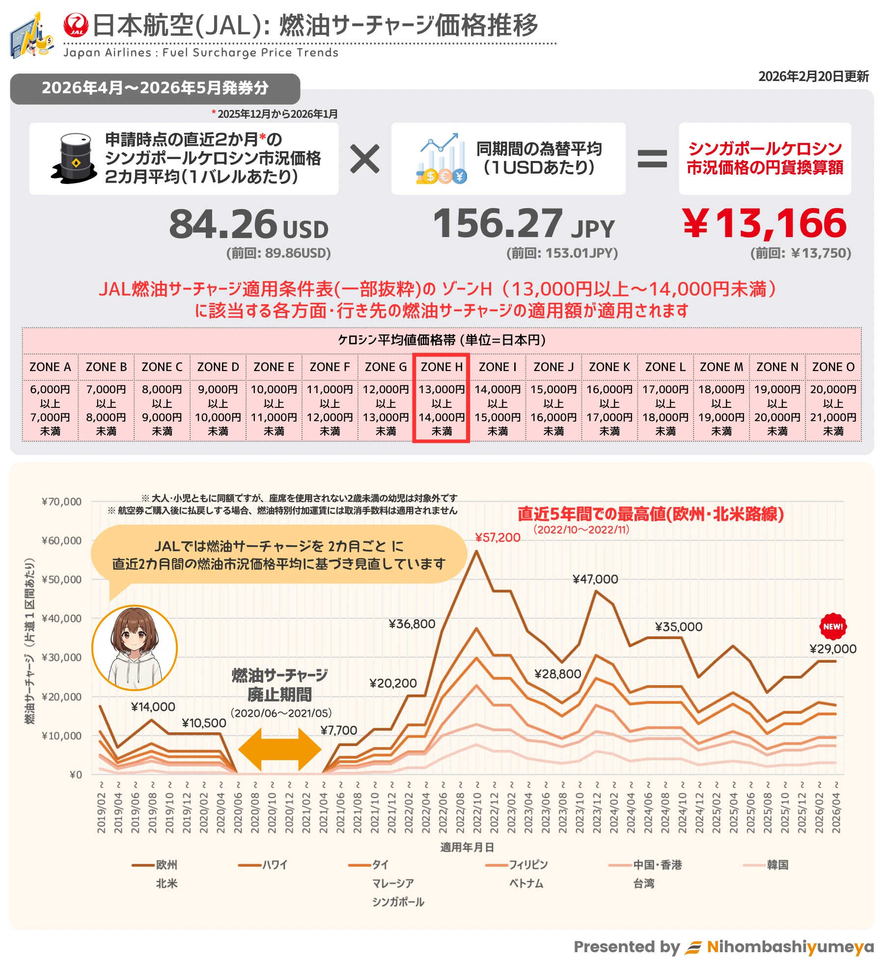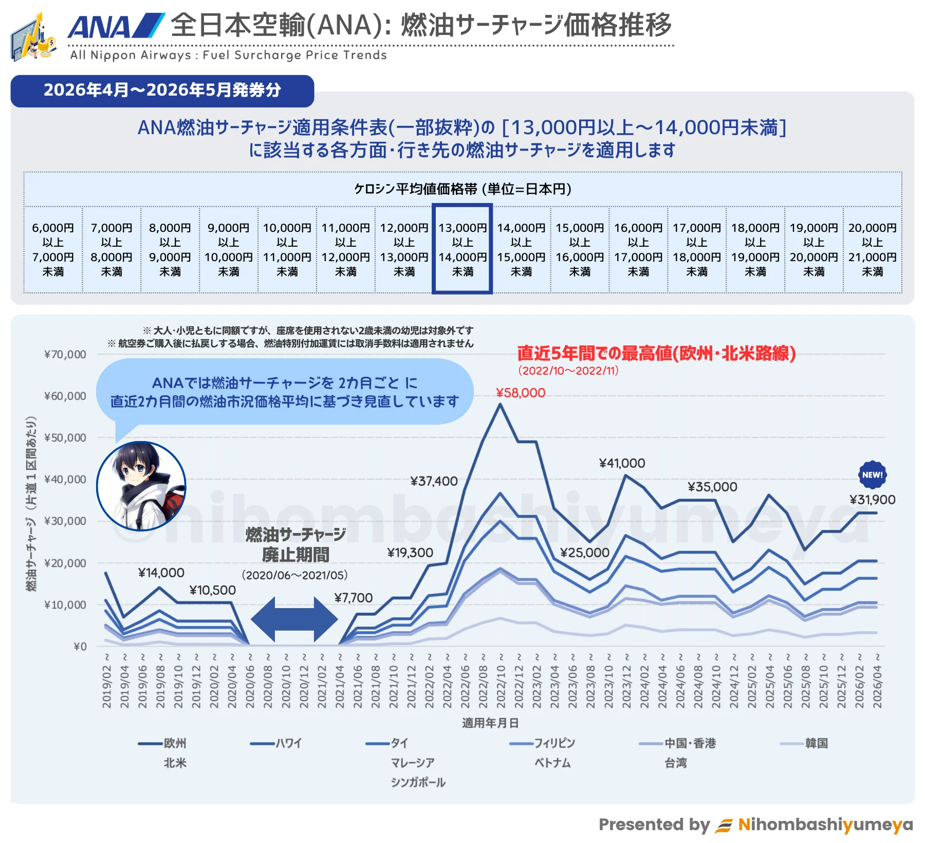 なお、日本発旅程はシンガポールケロシン市況価格の平均に同期間の為替レートの平均を掛け合わせた価格が 6,000円を下回った場合 、燃油サーチャージの適用は廃止されます。