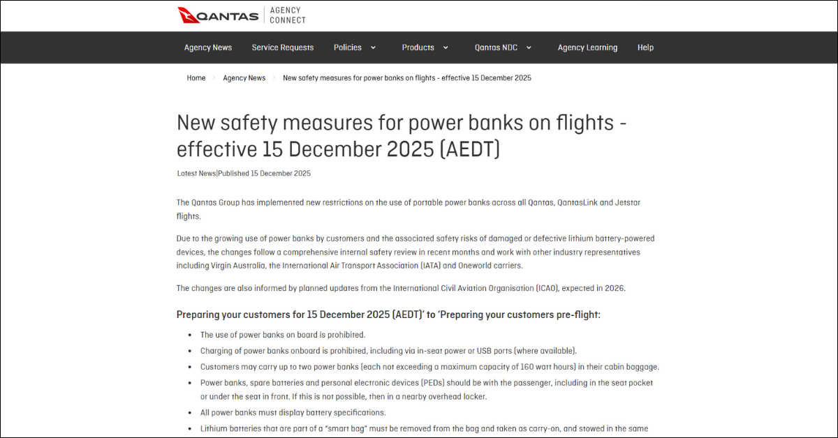 カンタス航空は、2025年12月15日から機内におけるモバイルバッテリー(パワーバンク)に関する新しい安全措置を実施します。