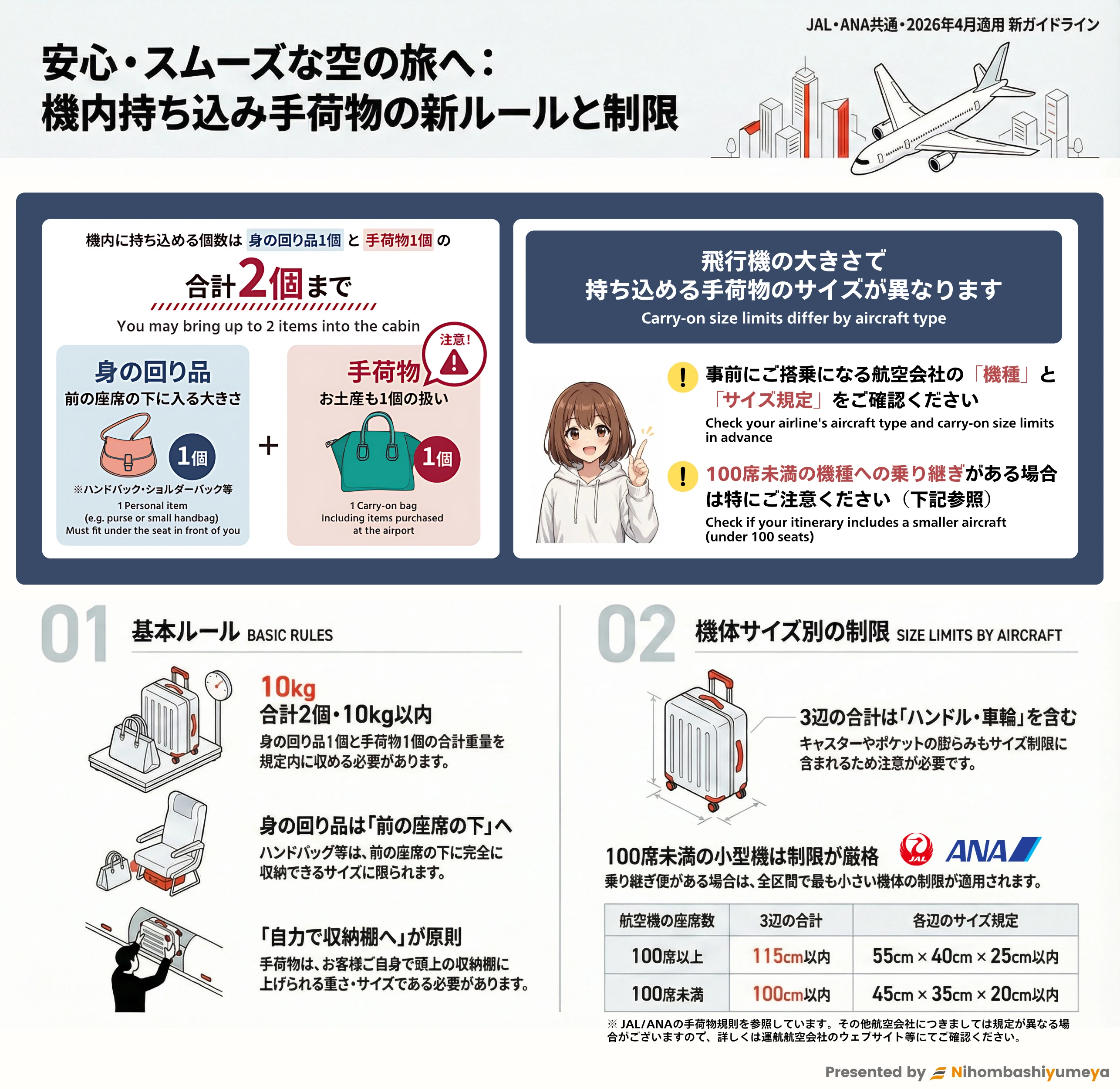 | ②乗客自身が頭上の棚に収納できるサイズ・重さの手荷物のみ持ち込み可 | |