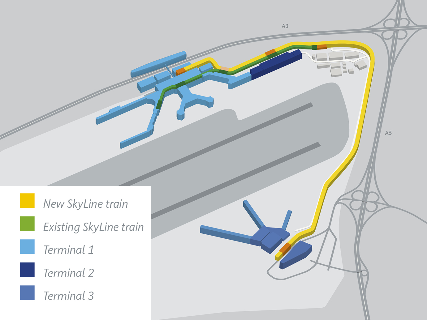 - 第3ターミナルは既存のターミナル1・ターミナル2とは空港南側の対岸に位置しており、SkyLine(スカイライン)と呼ばれる無人自動走行の連絡列車(約8分)でターミナル間を移動できます。