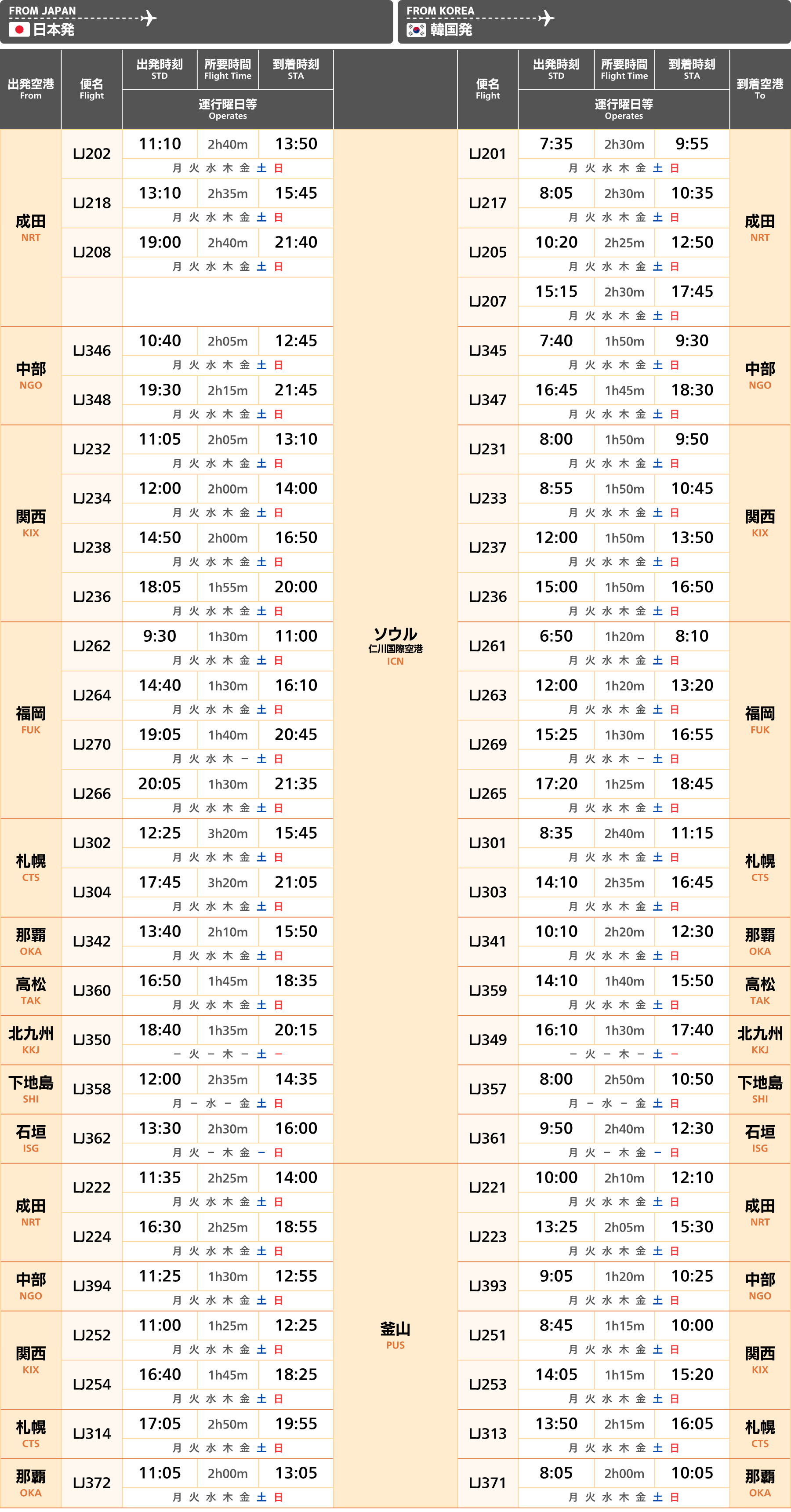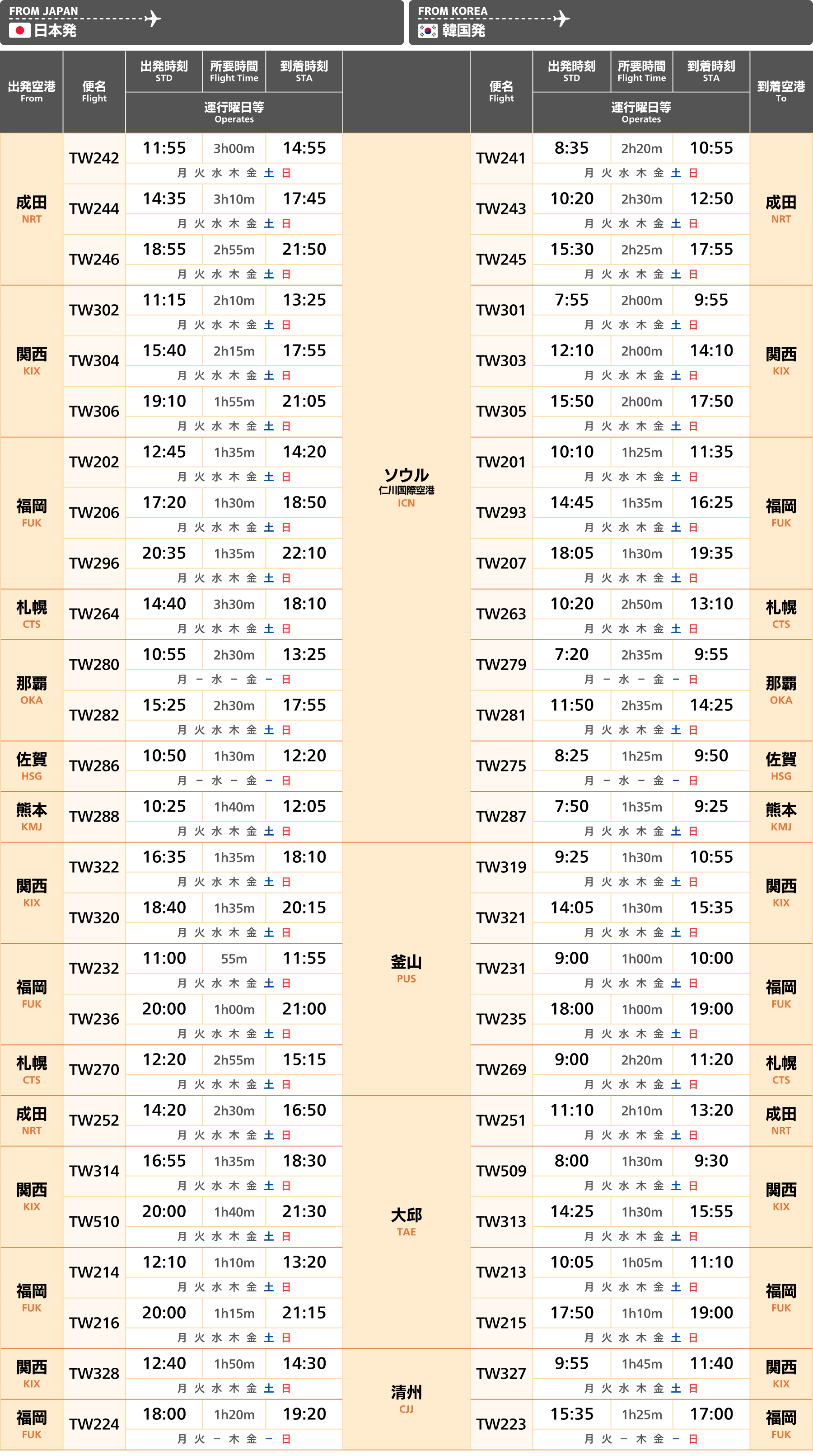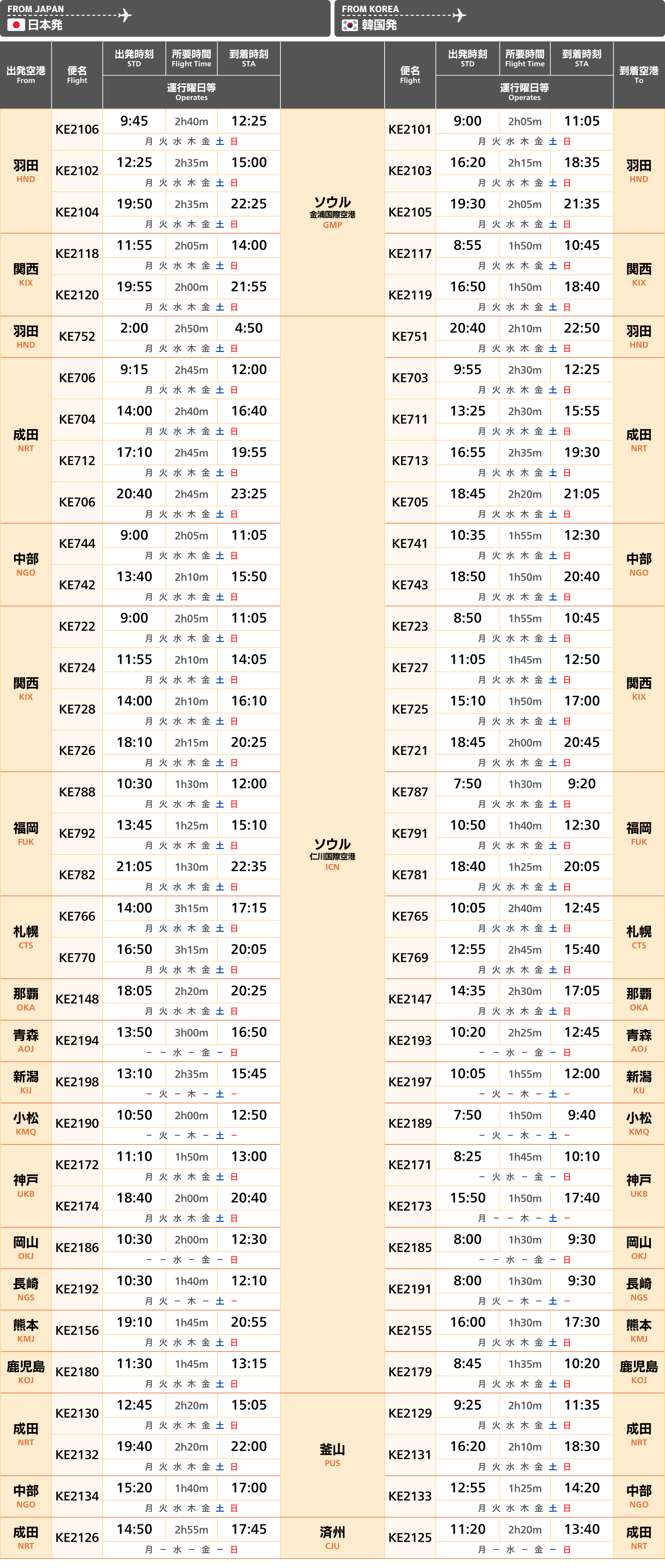 韓国|直行便 航空会社時刻表・運航状況【2025年冬季スケジュール】 日本航空 全日本空輸 大韓航空 アシアナ航空 チェジュ航空 ジンエアー ティーウェイ航空 エアソウル エアプサン イースター航空 エアプレミア エチオピア航空 海外航空券|問い合わせフォーム 海外航空券トップ