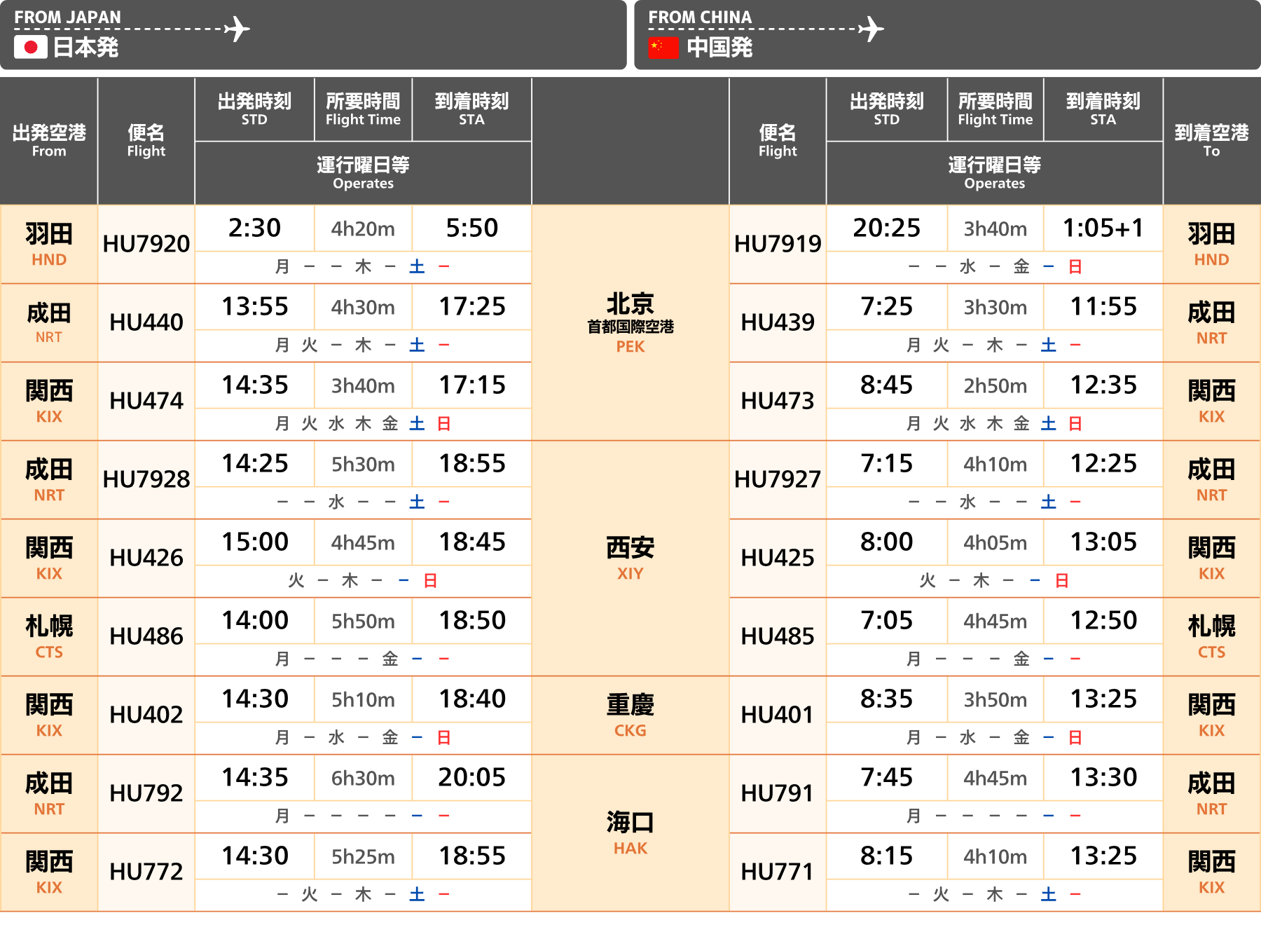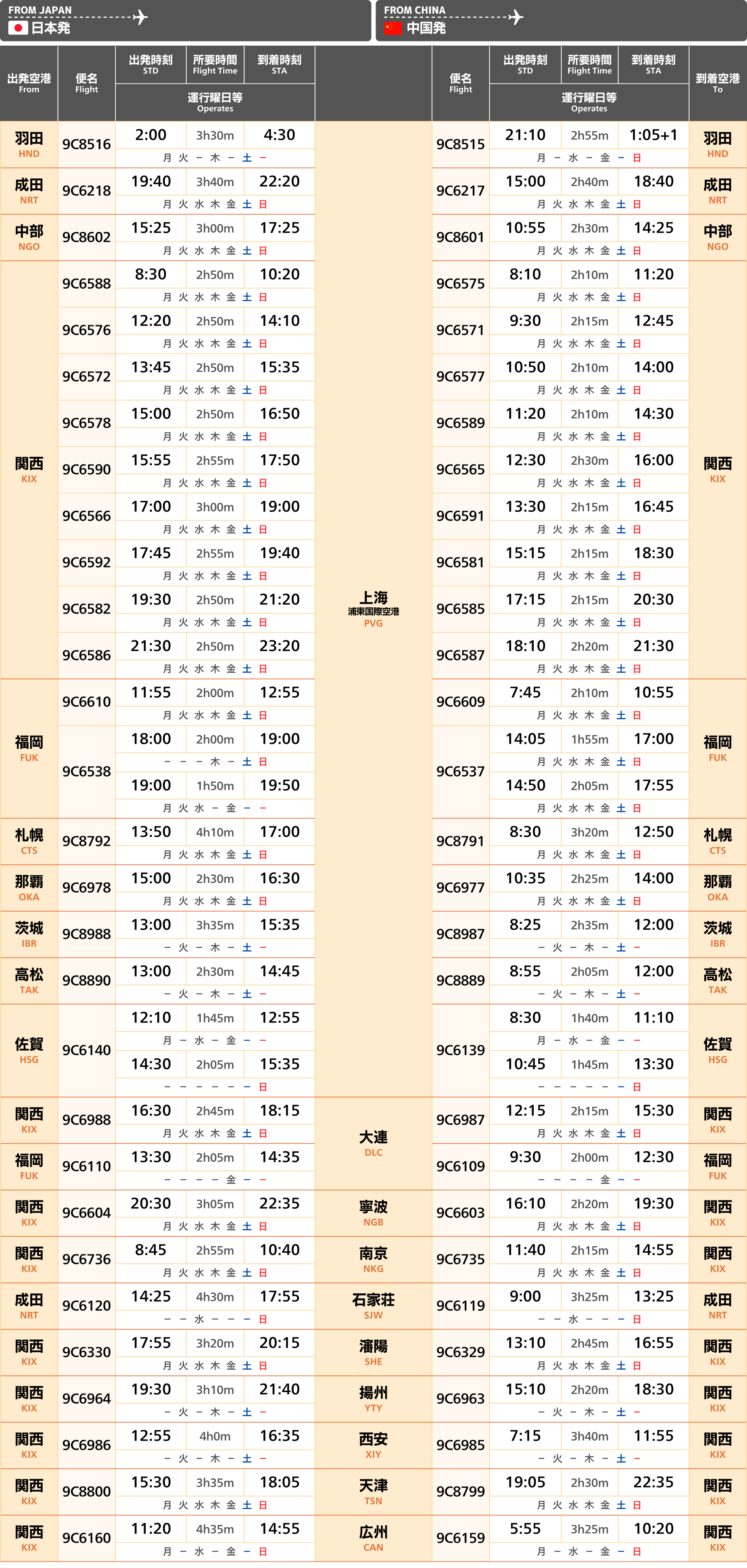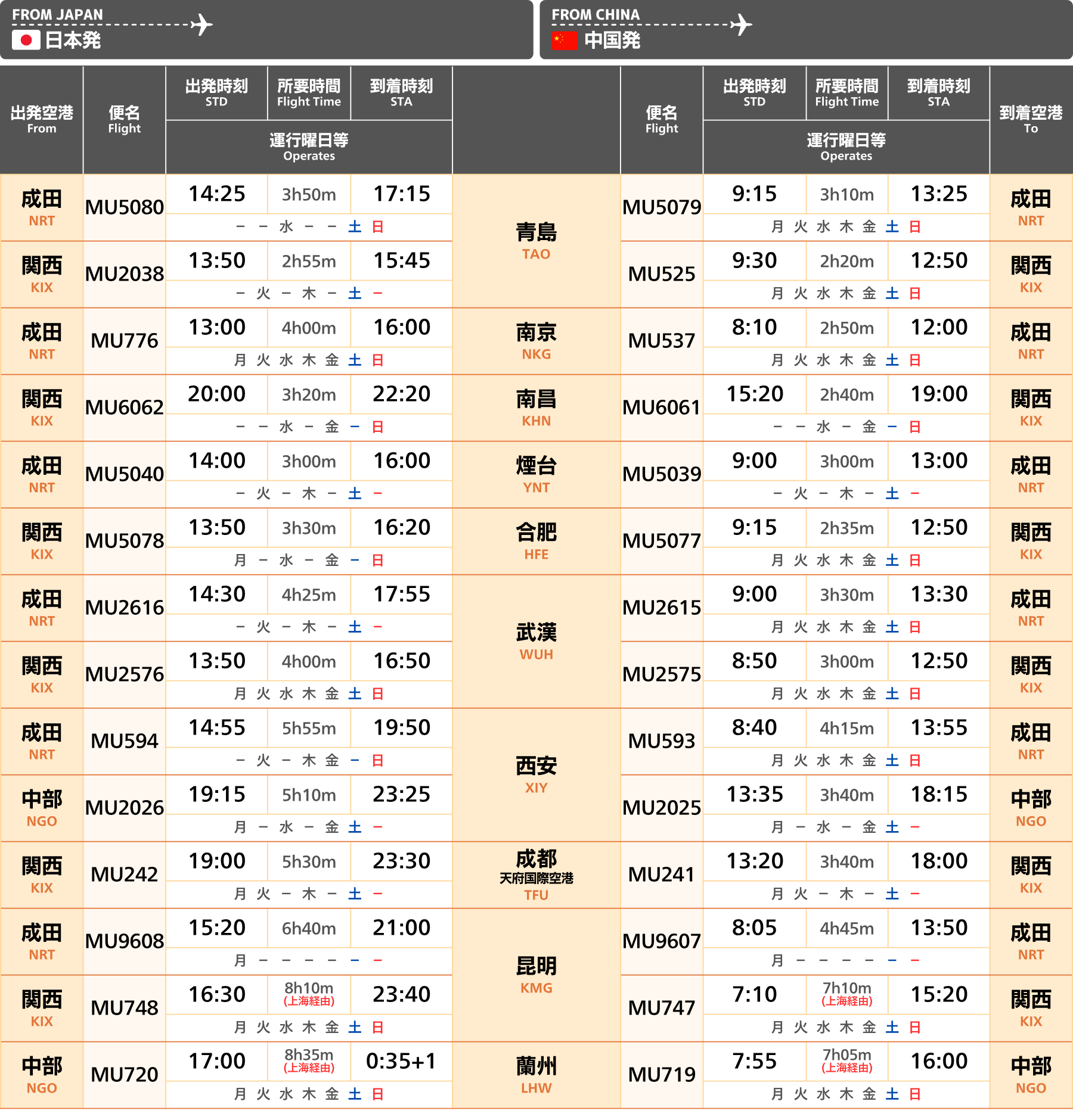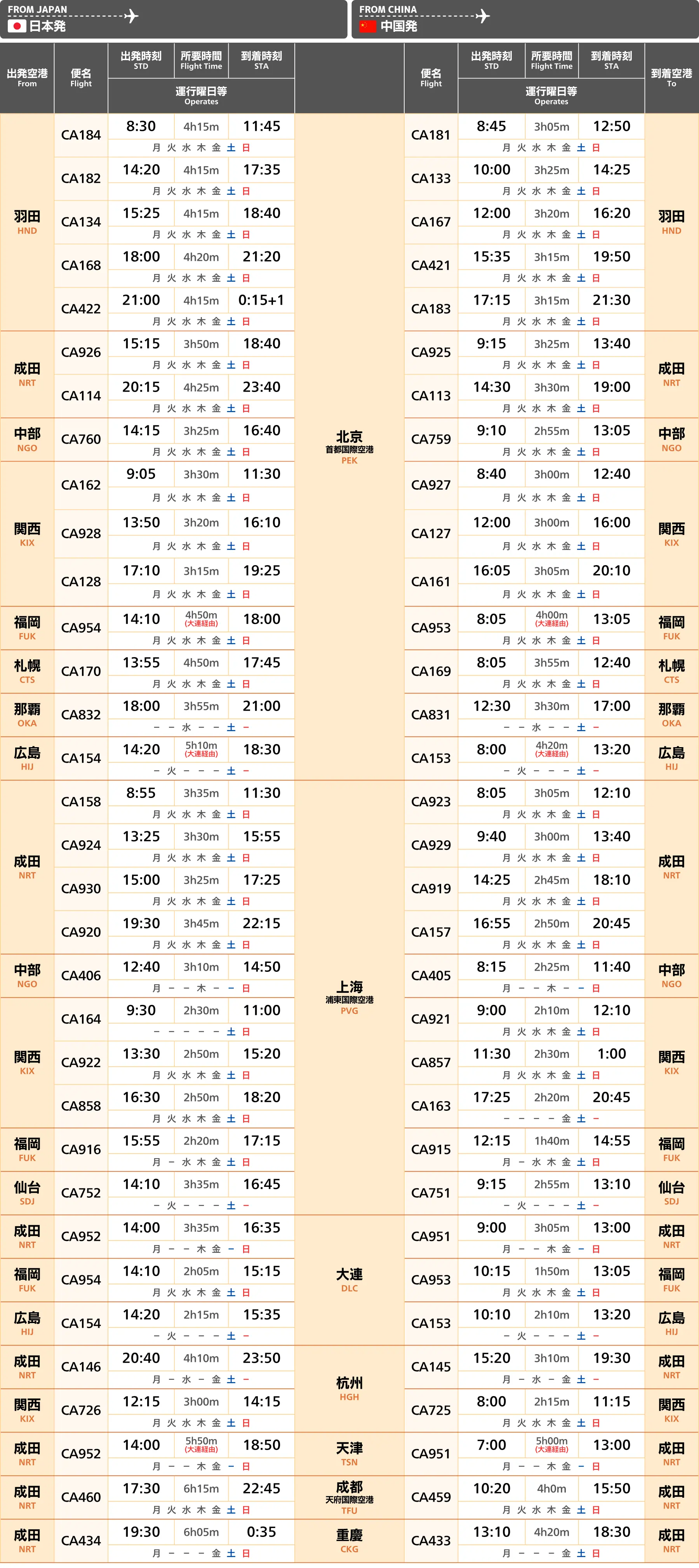 中国|直行便 航空会社時刻表・運航状況【2025年冬季スケジュール】 日本航空 全日本空輸 スプリング・ジャパン 中国国際航空 中国南方航空 中国東方航空 上海航空 吉祥航空 春秋航空 厦門航空 深圳航空 北京首都航空 天津航空 山東航空 海南航空 四川航空 長竜航空 海外航空券|問い合わせフォーム 海外航空券トップ