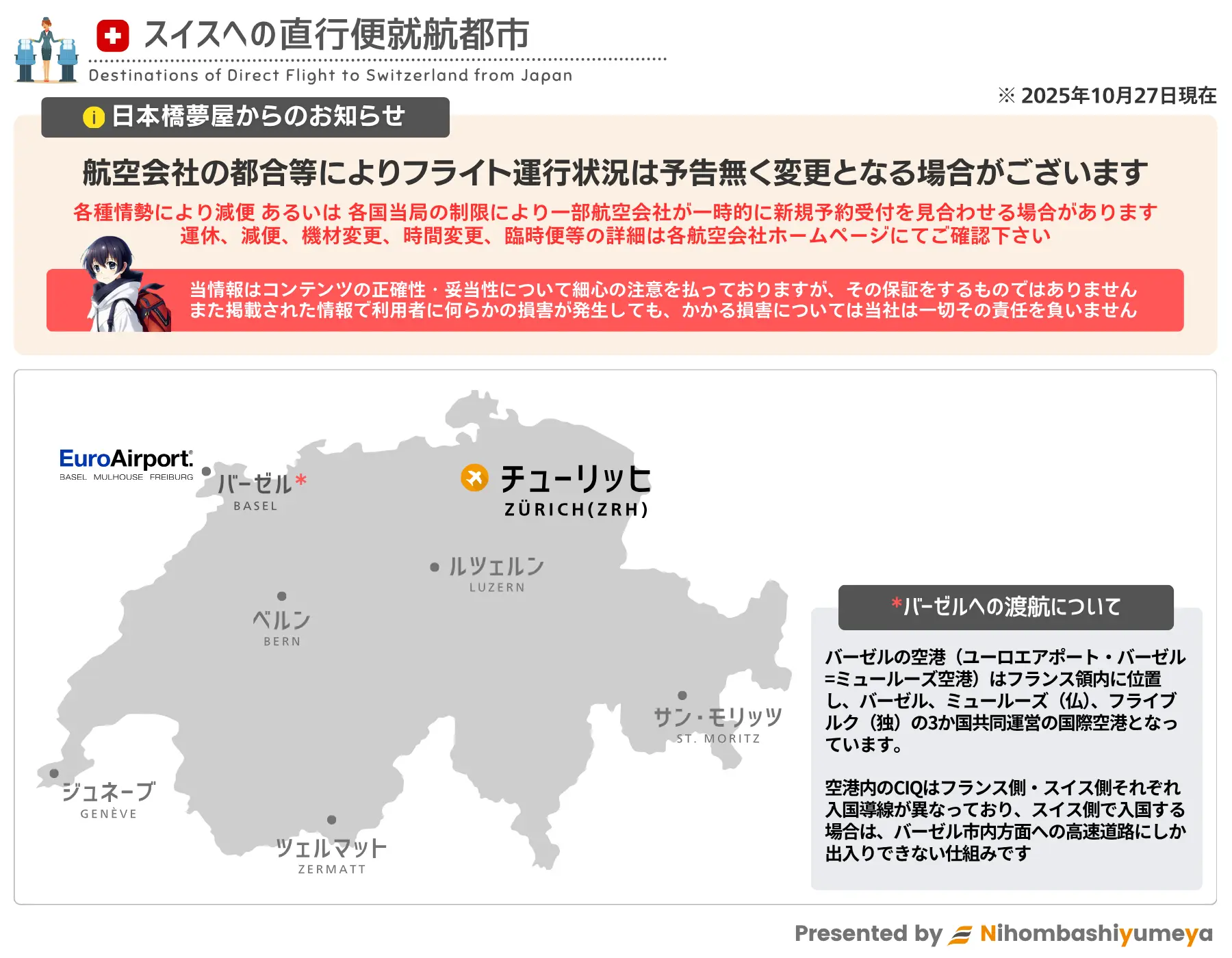 スイス|直行便 航空会社時刻表・運航状況【2025年冬季スケジュール】