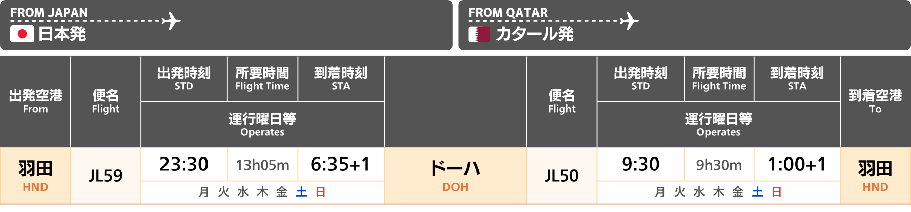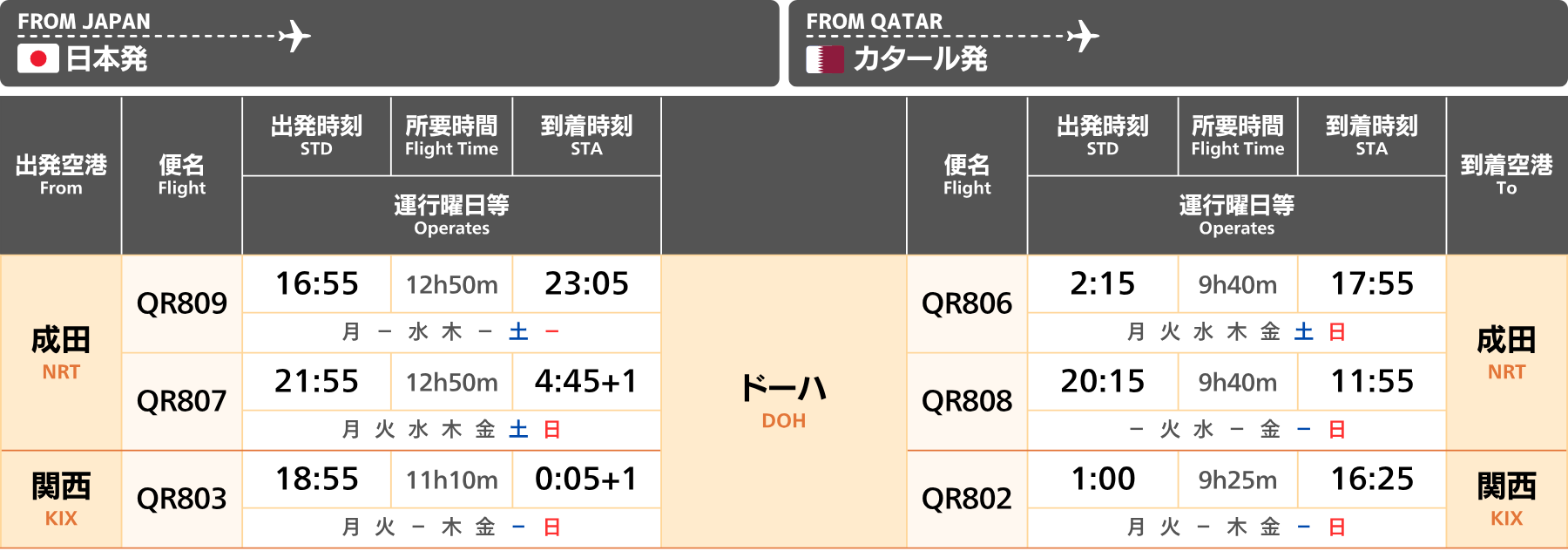 カタール|直行便 航空会社時刻表・運航状況【2025年冬季スケジュール】
