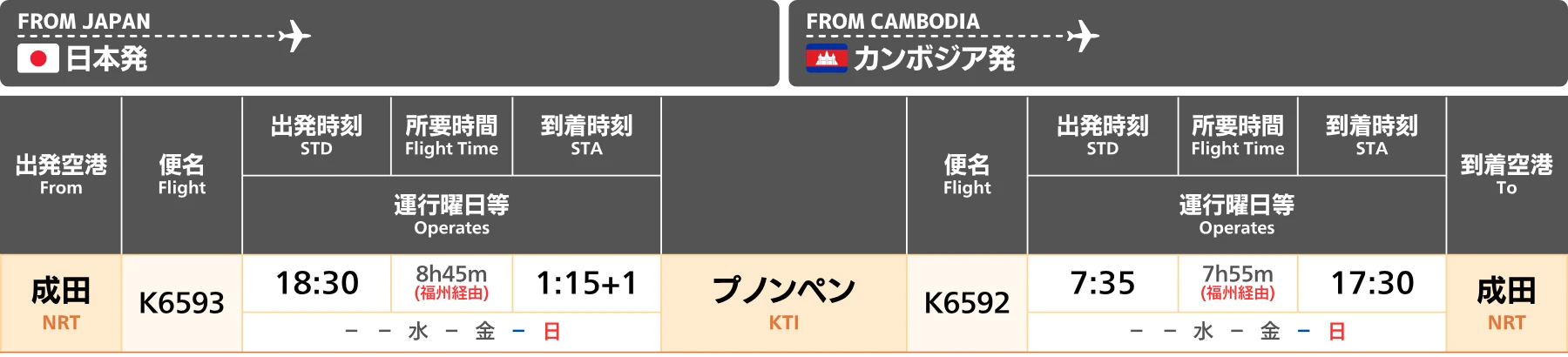 カンボジア|直行便 航空会社時刻表・運航状況【2026年夏季スケジュール】