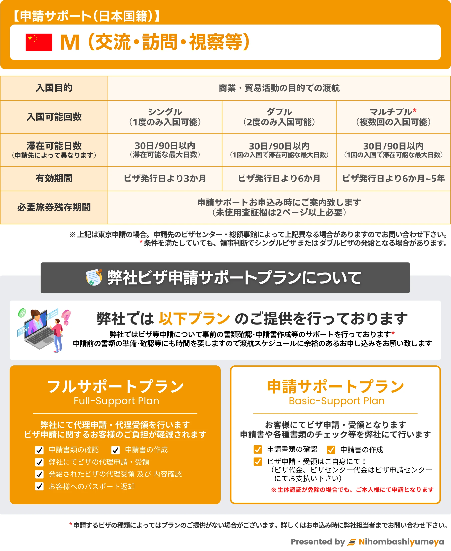 弊社では中国商業・貿易ビザ(M)申請サポートを下記の通り行っております。