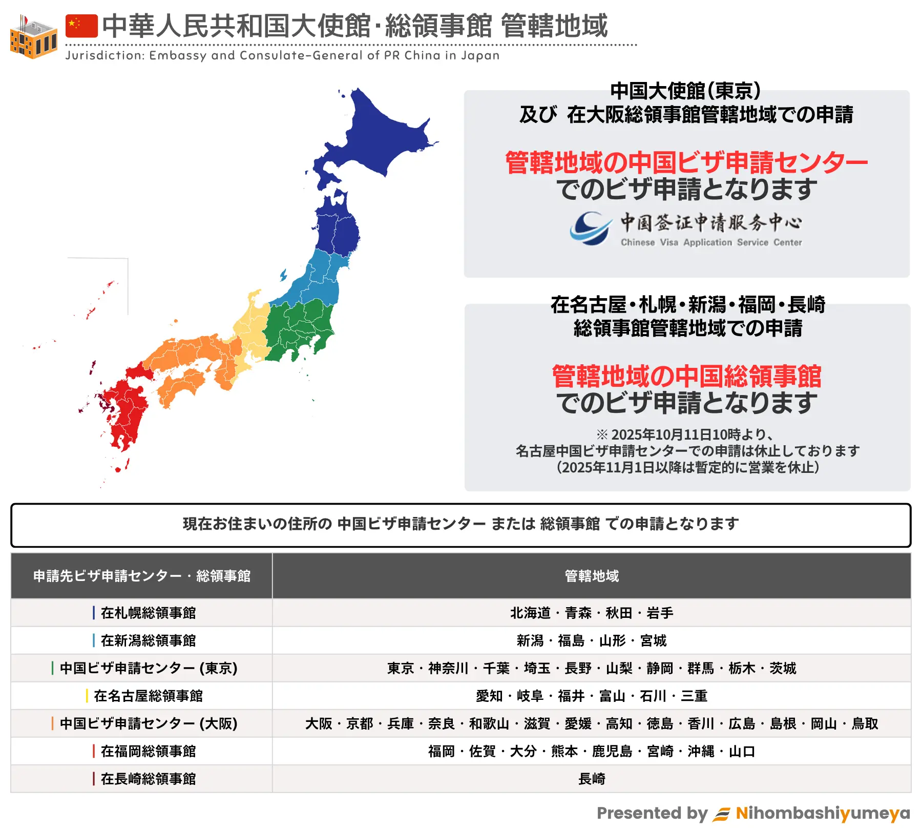 それぞれの管轄区域に対応する中国ビザ申請センター または 総領事館 にて申請する必要があります。