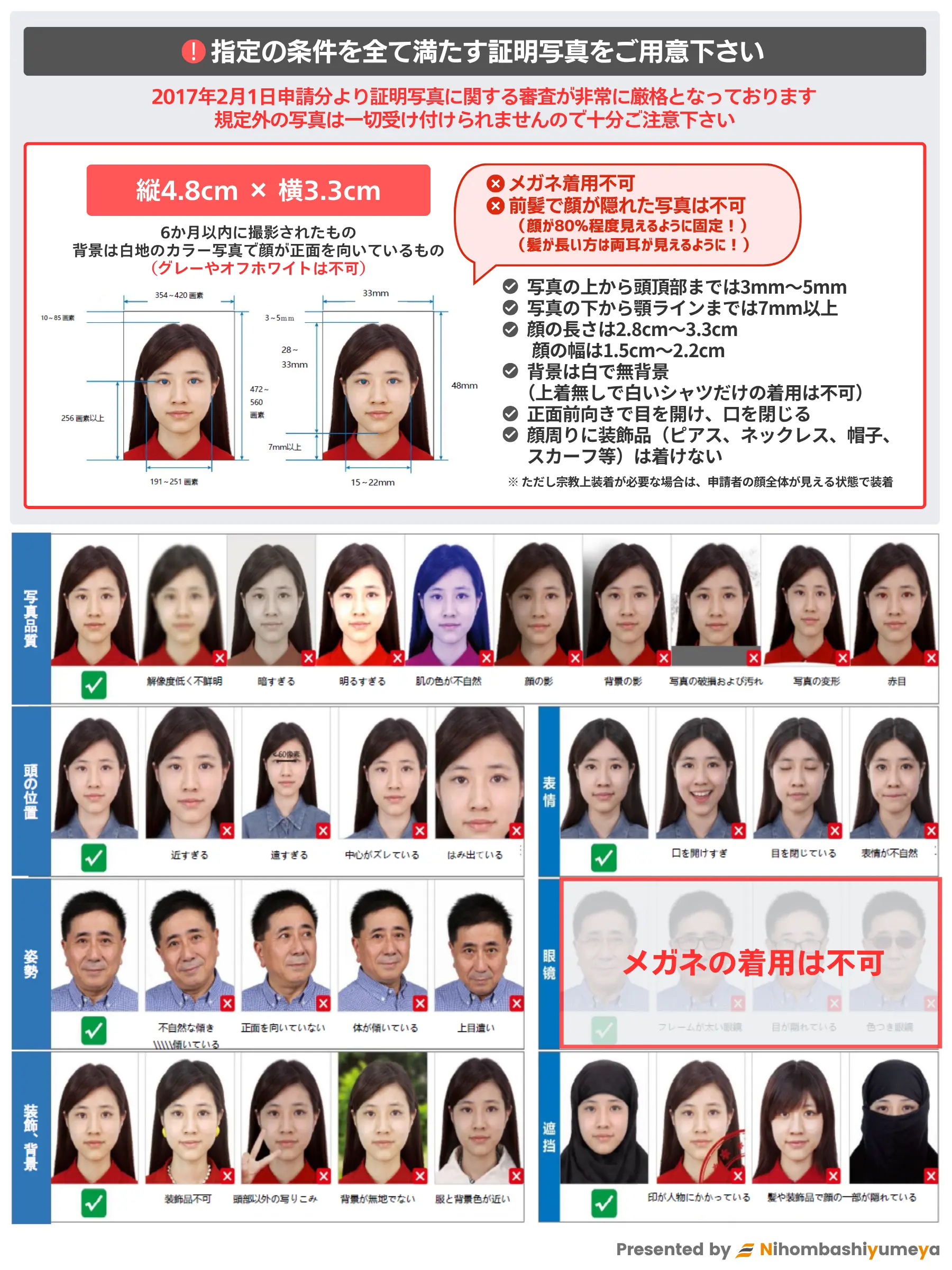 証明写真 1枚 + 画像データ | オリジナルの写真はパスポート送付時にご提出ください (オンライン申請書にアップロードする画像データと同じ証明写真が必要です) 画像データ JPEGファイル(サイズ:40KB~1MB、354×472px以上) 縦4.8cm × 横3.3cm - 6か月以内に撮影されたカラー写真のもの (発行から6か月経過したパスポートと同じ写真は不可) - 写真の上から頭頂部までは3mm~5mm - 写真の下から顎ラインまでは7mm以上 - 顔の長さ2.8cm~3.3cm、顔の幅1.5cm~2.2cm - メガネの着用不可 - 前髪で顔が隠れた写真は不可 - 額が80%程度見えるもの - 背景は白で無背景 - 上着無しで白いシャツだけの着用は背景と同化するため不可 - 正面前向きで目を開け口を閉じ、耳と眉毛が見える状態 - 顔周りに装飾品(ピアス、ネックレス、帽子等)をつけない |
