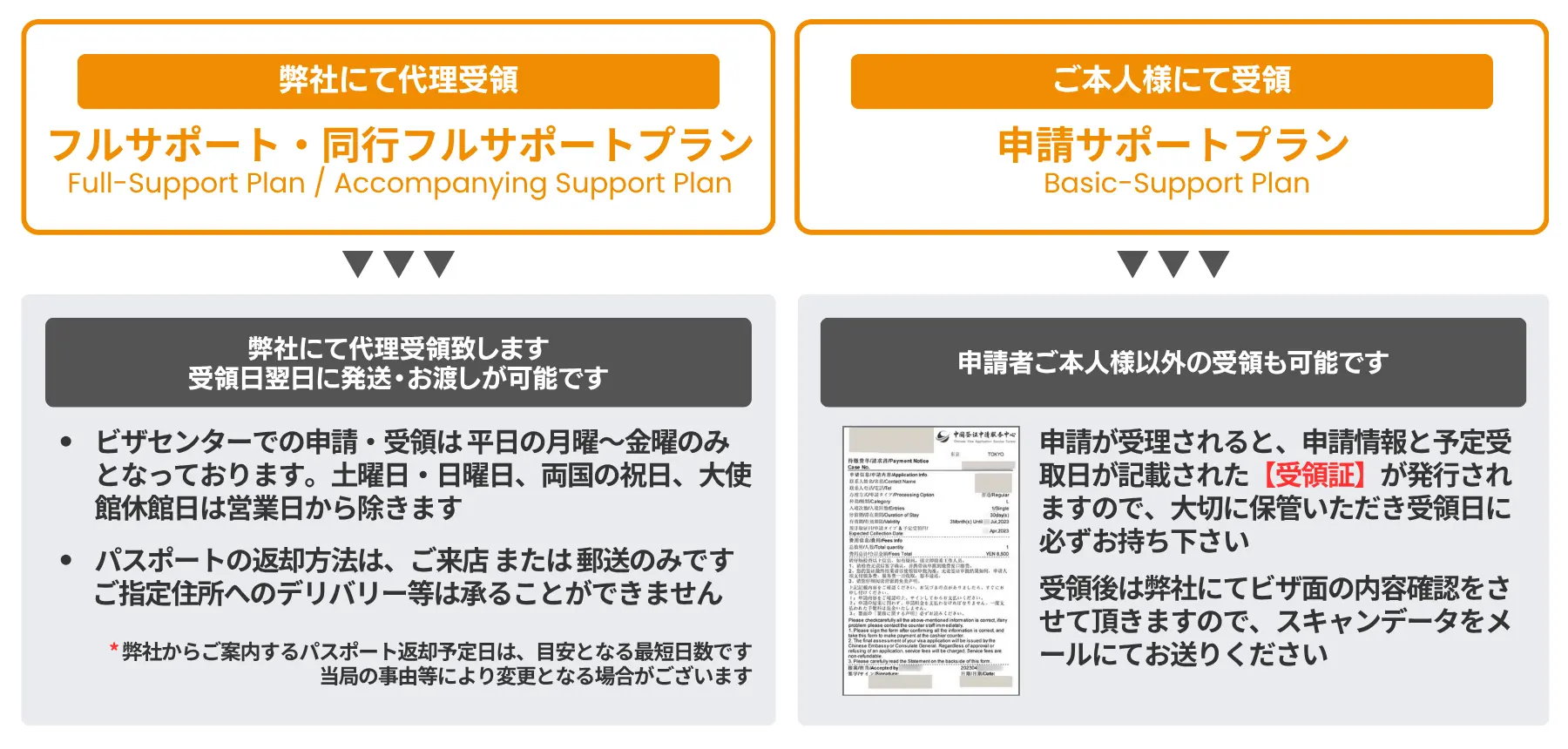 フルサポートプラン・同行フルサポートプランお申し込みの場合は、弊社よりパスポートをご郵送(または弊社にご来店)にてご返却致します。申請サポートプランの場合は、受領証に記載された日時以降にビザセンターにてお受け取りください。